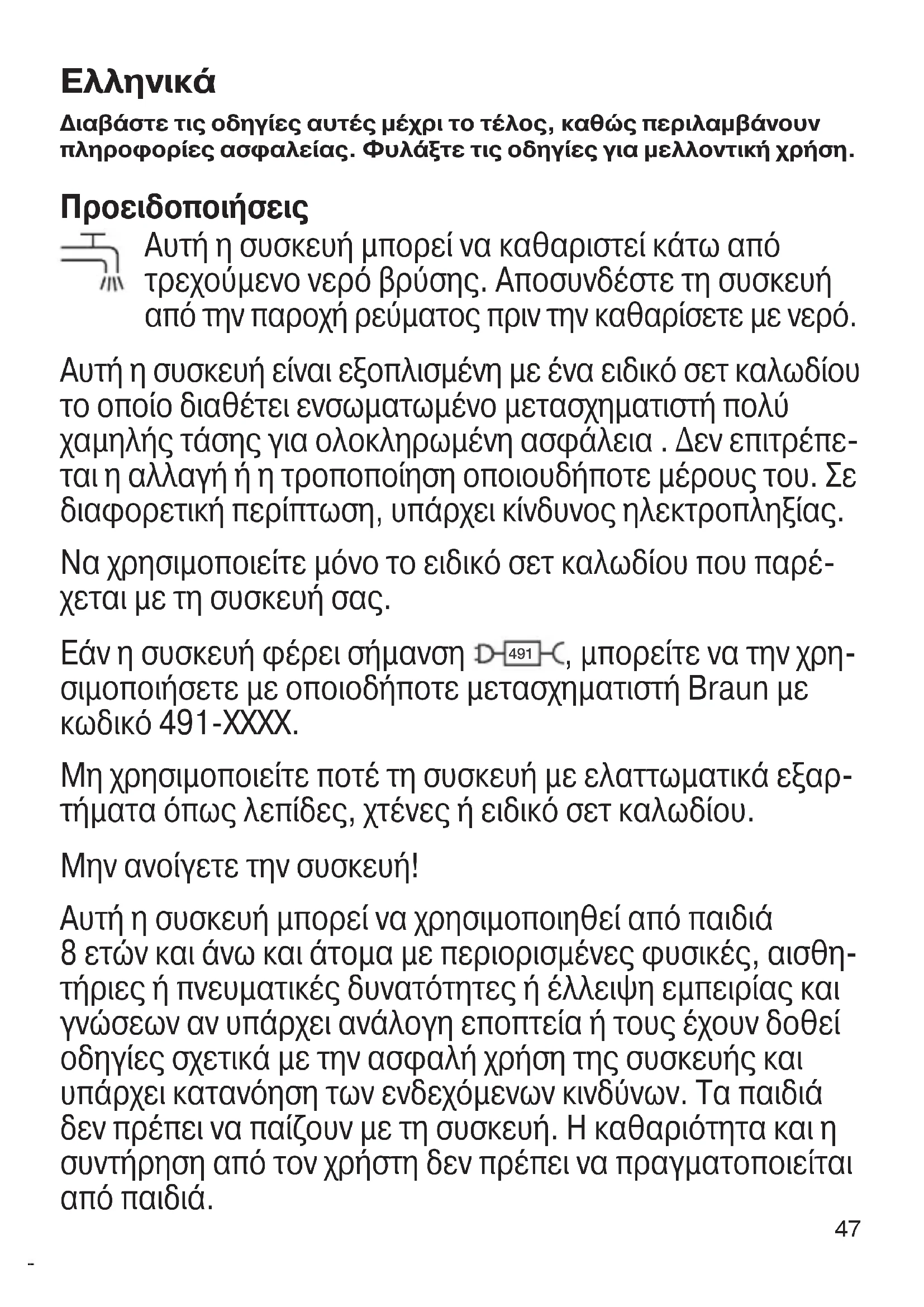, μπορείτε να την χρη- σιμοποιήσετε με οποιοδήποτε μετασχηματιστή Braun με κωδικό 491-XXXX. Μη χρησιμοποιείτε ποτέ τη συσκευή με ελαττωματικά εξαρ- τήματα όπως λεπίδες, χτένες ή ειδικό σετ καλωδίου. Μην ανοίγετε την συσκευή! Αυτή η συσκευή μπορεί να χρησιμοποιηθεί από παιδιά 8 ετών και άνω και άτομα με περιορισμένες φυσικές, αισθη- τήριες ή πνευματικές δυνατότητες ή έλλειψη εμπειρίας και γνώσεων αν υπάρχει ανάλογη εποπτεία ή τους έχουν δοθεί οδηγίες σχετικά με την ασφαλή χρήση της συσκευής και υπάρχει κατανόηση των ενδεχόμενων κινδύνων. Τα παιδιά δεν πρέπει να παίζουν με τη συσκευή. Η καθαριότητα και η συντήρηση από τον χρήστη δεν πρέπει να πραγματοποιείται από παιδιά. 90640279_BT_3242_3241_3240_3940_MN_ANZ.indd 4790640279_BT_3242_3241_3240_3940_MN_ANZ.indd 47 15.05.19 10:2615.05.19 10:26 Business Use - P&G AUTHORIZED POA-00132899 Rev 001 Effective Date 2019-05-23 Printed 2020-10-06 Page 47 of 5248