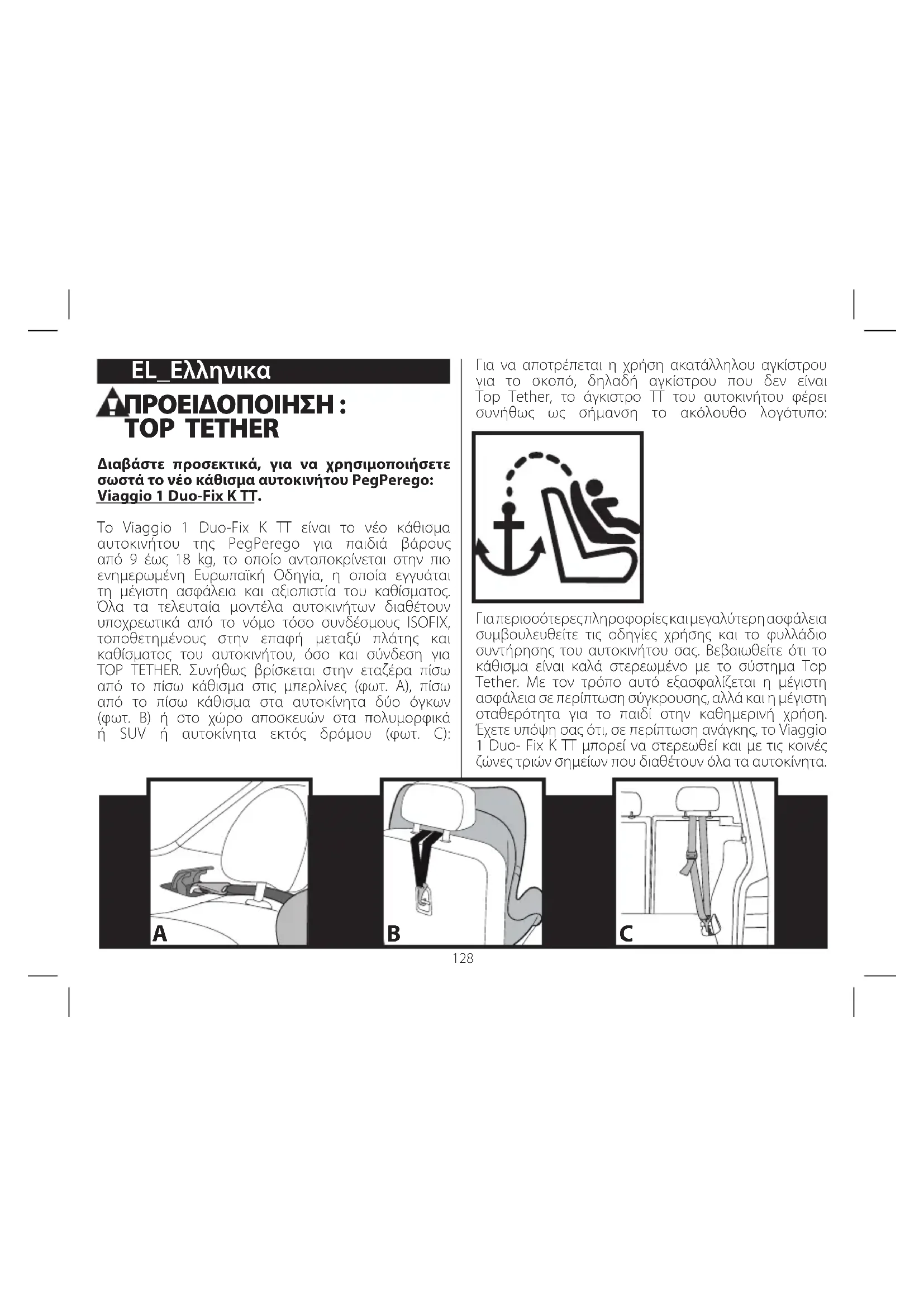 - Progresivni proizvodni broj: svaka sjedalica ima vlastiti broj, od izdavanja potvrde o usklađivanju svaki se razlikuje po vlastitom broju. Sva intelektualna prava koja se odnose na sadržaj ovoga priručnika za uporabu u vlasništvu su PEG PEREGO S.p.A. i zaštićena su važećim zakonima. PEG-PÉREGO S.p.A. Peg-Pérego S.p.A. ima certifikat ISO 9001. Certifikacija pruža kupcima i korisnicima jamstvo transparentnosti i povjerenja u način poslovanja tvrtke. Peg Pérego može bez prethodne najave mijenjati modele opisane u ovom dokumentu radi tehničkih ili komercijalnih razloga. Peg Pérego stoji na raspolaganju vlastitim kupcima za udovoljavanje svih zahtjeva, u okviru vlastitih mogućnosti Da bismo postigli navedene ciljeve, mišljenje naših kupaca za nas je vrlo vrijedno i važno. Bili bismo Vam izuzetno zahvalni kad biste nakon uporabe našega proizvoda, popunili UPITNIK O ZADOVOLJSTVU KUPCA, koji se nalazi na web stranici: www.pegperego.com i tako nam uputili vaše primjedbe ili prijedloge. Služba Za Podršku Peg-Pérego U slučaju gubitka ili oštećenja dijelova proizvoda, koristite isključivo originalne dijelove Peg Pérego. Za moguće popravke, zamjene, informacije o proizvodima, prodaji originalnih rezervnih dijelova i opreme obratite se Službi za podršku Peg Pérego, po mogućnosti sa serijskim brojem proizvoda. tel. 0039/039/60.88.213 zeleni broj: 800/147.414 (poziv iz fiksne mreže) faks 0039/039/33.09.992 e-mail assistenza@pegperego.it internet stranica www.pegperego.com128 ΠΡΟΕΙΔΟΠΟΙΗΣΗ : TOP TETHER Διαβάστε προσεκτικά, για να χρησιμοποιήσετε σωστά το νέο κάθισμα αυτοκινήτου PegPerego: Viaggio 1 Duo-Fix K TT. Το Viaggio 1 Duo-Fix K TT είναι το νέο κάθισμα αυτοκινήτου της PegPerego για παιδιά βάρους από 9 έως 18 kg, το οποίο ανταποκρίνεται στην πιο ενημερωμένη Ευρωπαϊκή Οδηγία, η οποία εγγυάται τη μέγιστη ασφάλεια και αξιοπιστία του καθίσματος. Όλα τα τελευταία μοντέλα αυτοκινήτων διαθέτουν υποχρεωτικά από το νόμο τόσο συνδέσμους ISOFIX, τοποθετημένους στην επαφή μεταξύ πλάτης και καθίσματος του αυτοκινήτου, όσο και σύνδεση για TOP TETHER. Συνήθως βρίσκεται στην εταζέρα πίσω από το πίσω κάθισμα στις μπερλίνες (φωτ. A), πίσω από το πίσω κάθισμα στα αυτοκίνητα δύο όγκων (φωτ. B) ή στο χώρο αποσκευών στα πολυμορφικά ή SUV ή αυτοκίνητα εκτός δρόμου (φωτ. C): Για να αποτρέπεται η χρήση ακατάλληλου αγκίστρου για το σκοπό, δηλαδή αγκίστρου που δεν είναι Top Tether, το άγκιστρο TT του αυτοκινήτου φέρει συνήθως ως σήμανση το ακόλουθο λογότυπο: Για περισσότερες πληροφορίες και μεγαλύτερη ασφάλεια συμβουλευθείτε τις οδηγίες χρήσης και το φυλλάδιο συντήρησης του αυτοκινήτου σας. Βεβαιωθείτε ότι το κάθισμα είναι καλά στερεωμένο με το σύστημα Top Tether. Με τον τρόπο αυτό εξασφαλίζεται η μέγιστη ασφάλεια σε περίπτωση σύγκρουσης, αλλά και η μέγιστη σταθερότητα για το παιδί στην καθημερινή χρήση. Έχετε υπόψη σας ότι, σε περίπτωση ανάγκης, το Viaggio 1 Duo- Fix K TT μπορεί να στερεωθεί και με τις κοινές ζώνες τριών σημείων που διαθέτουν όλα τα αυτοκίνητα. BA C ΕL_Eλληνικα Σας ευχαριστούμε που επιλέξατε ένα προϊόν Peg-Perego. Χαρακτηριστικά προϊόντος Κάθισμα αυτοκινήτου, Ομάδα 1, κατηγορία “Universal” με ζώνες