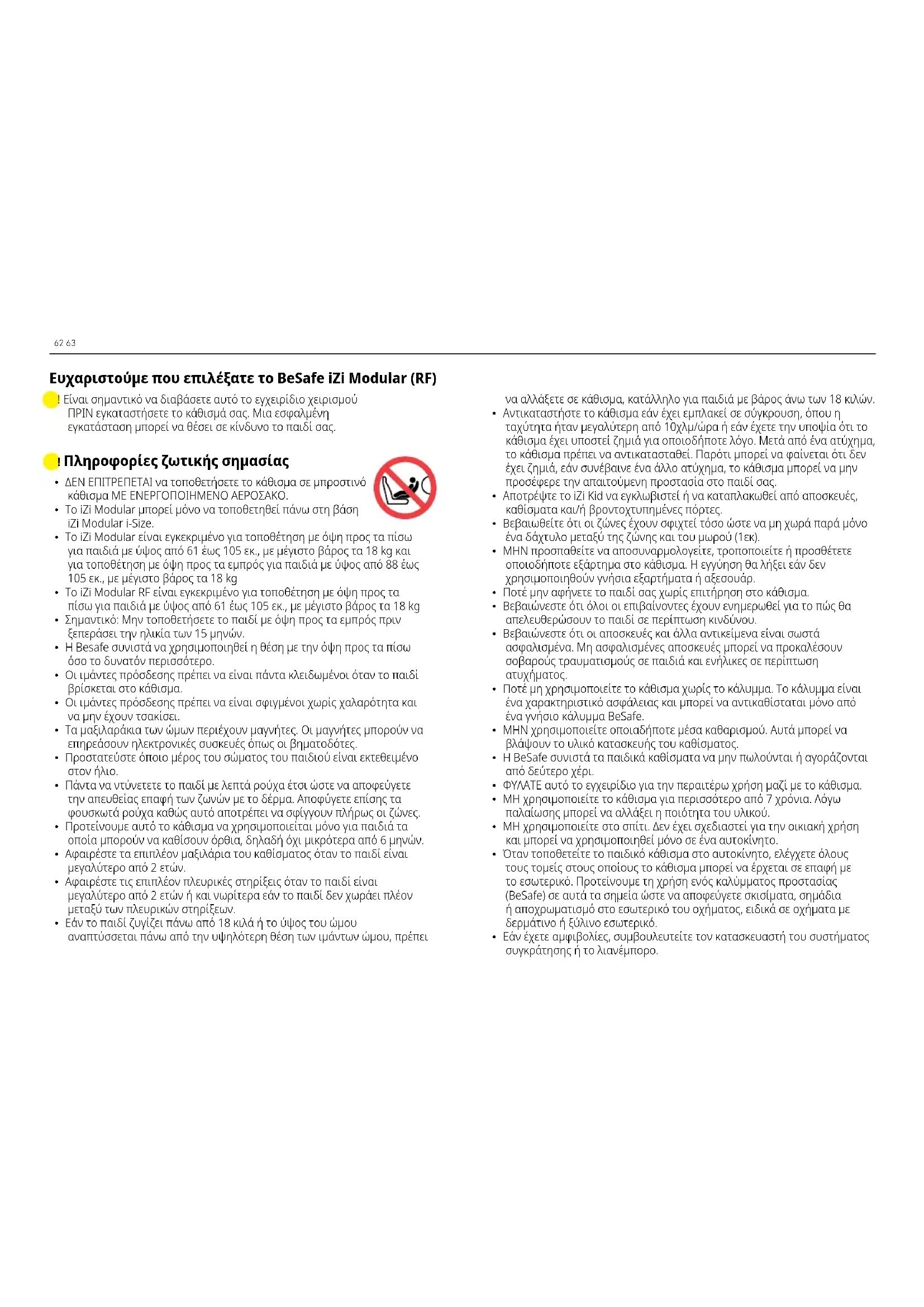 - Εάν το παιδί ζυγίζει πάνω από 18 κιλά ή το ύψος του ώμου αναπτύσσεται πάνω από την υψηλότερη θέση των ιμάντων ώμου, πρέπει Ευχαριστούμε που επιλέξατε το BeSafe iZi Modular (RF) ! Είναι σημαντικό να διαβάσετε αυτό το εγχειρίδιο χειρισμού ΠΡΙΝ εγκαταστήσετε το κάθισμά σας. Μια εσφαλμένη εγκατάσταση μπορεί να θέσει σε κίνδυνο το παιδί σας. να αλλάξετε σε κάθισμα, κατάλληλο για παιδιά με βάρος άνω των 18 κιλών.