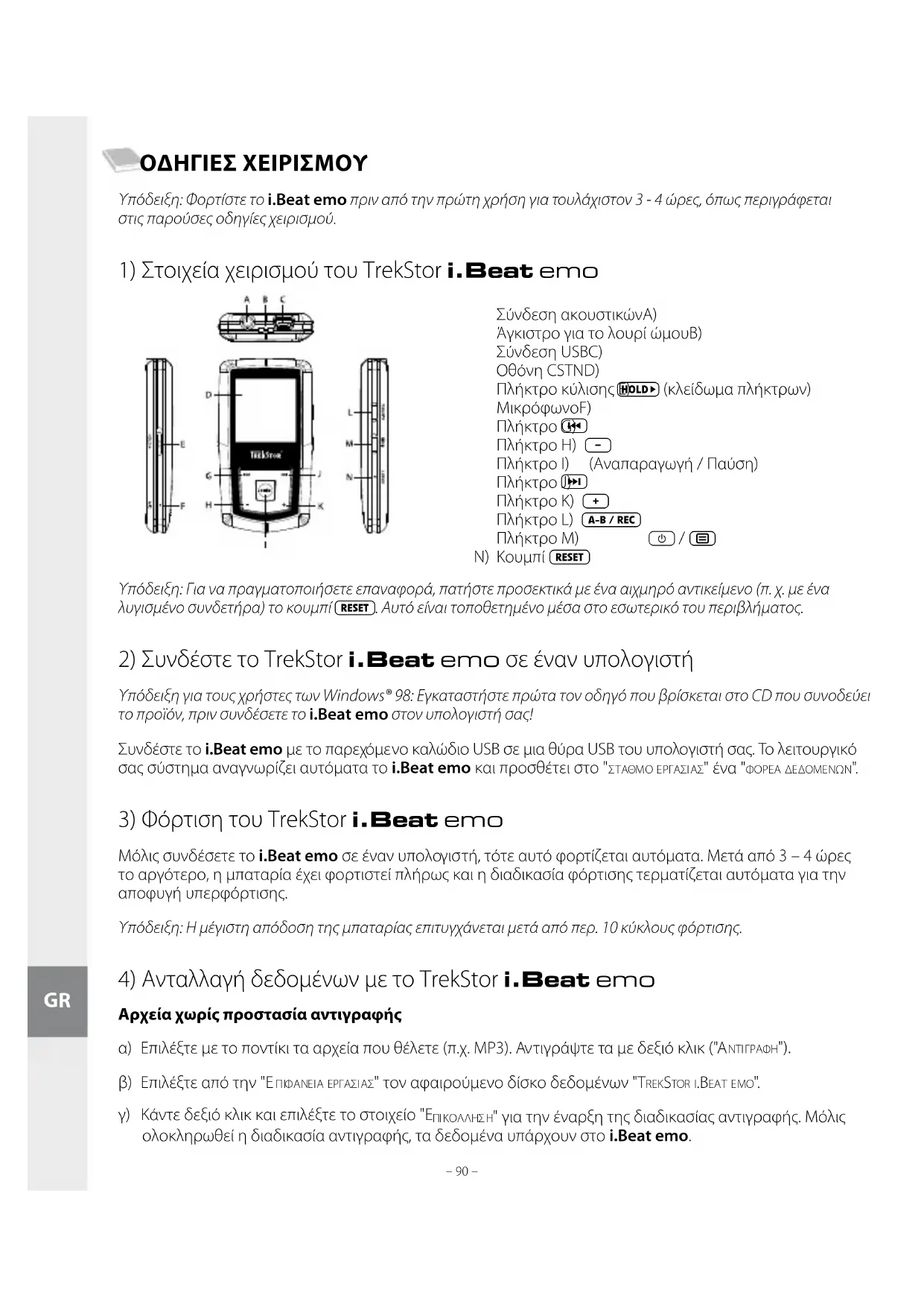 Αρχεία χωρίς προστασία αντιγραφής α) Επιλέξτε με το ποντίκι τα αρχεία που θέλετε (π.χ. MP3). Αντιγράψτε τα με δεξιό κλικ ("α ν τ ί γ ρ α φ ή "). β) Επιλέξτε από την "ε π ίφ α νε ί α ε ρ γ α σ ί α σ " τον αφαιρούμενο δίσκο δεδομένων "tr e K st o r i.be A t e m o ". γ) Κάντε δεξιό κλικ και επιλέξτε το στοιχείο "ε π ί κ ό λ λ ή σ ή " για την έναρξη της διαδικασίας αντιγραφής. Μόλις ολοκληρωθεί η διαδικασία αντιγραφής, τα δεδομένα υπάρχουν στο i.Beat emo.– 90 – – 91 –
