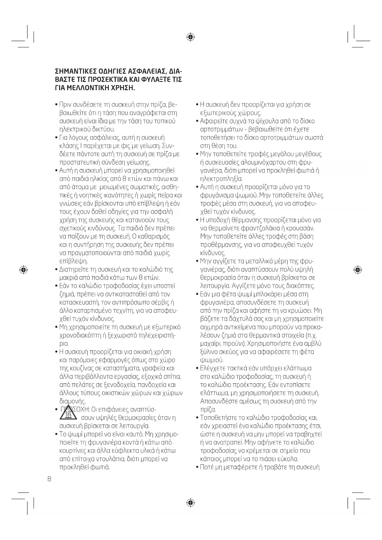 - Αυτή η συσκευή προορίζεται μόνο για το φρυγάνισμα ψωμιού. Μην τοποθετείτε άλλες τροφές μέσα στη συσκευή, για να αποφευ- χθεί τυχόν κίνδυνος.