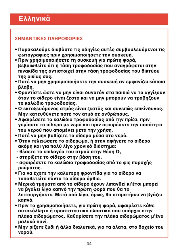 - Ποτέ να µην βυθίζετε το σίδερο µέσα στο νερ'.