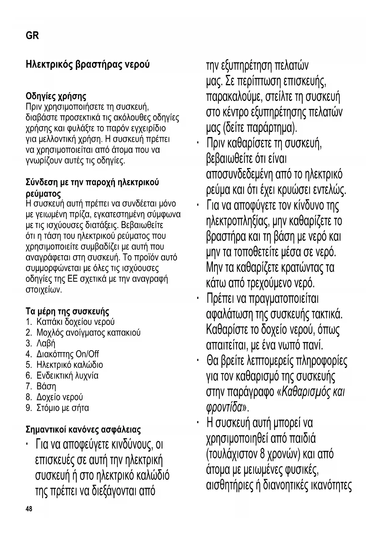 Σημαντικοί κανόνες ασφάλειας ∙ Για να αποφεύγετε κινδύνους, οι επισκευές σε αυτή την ηλεκτρική συσκευή ή στο ηλεκτρικό καλώδιό της πρέπει να διεξάγονται από την εξυπηρέτηση πελατών μας. Σε περίπτωση επισκευής, παρακαλούμε, στείλτε τη συσκευή στο κέντρο εξυπηρέτησης πελατών μας (δείτε παράρτημα). ∙ Πριν καθαρίσετε τη συσκευή, βεβαιωθείτε ότι είναι αποσυνδεδεμένη από το ηλεκτρικό ρεύμα και ότι έχει κρυώσει εντελώς. ∙ Για να αποφύγετε τον κίνδυνο της ηλεκτροπληξίας, μην καθαρίζετε το βραστήρα και τη βάση με νερό και μην τα τοποθετείτε μέσα σε νερό. Μην τα καθαρίζετε κρατώντας τα κάτω από τρεχούμενο νερό. ∙ Πρέπει να πραγματοποιείται αφαλάτωση της συσκευής τακτικά. Καθαρίστε το δοχείο νερού, όπως απαιτείται, με ένα νωπό πανί. ∙ Θα βρείτε λεπτομερείς πληροφορίες για τον καθαρισμό της συσκευής στην παράγραφο «Καθαρισμός και