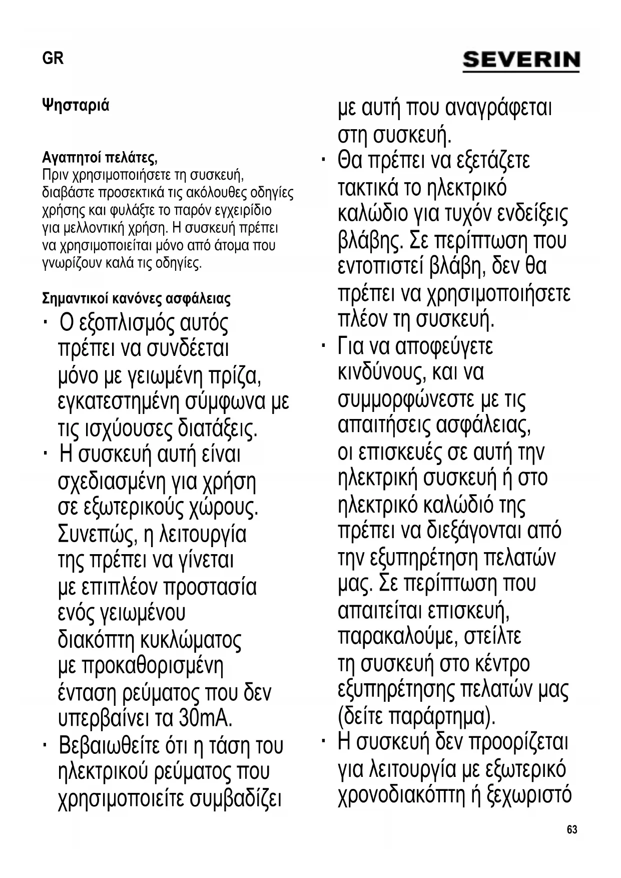 Αγαπητοί πελάτες, Πριν χρησιμοποιήσετε τη συσκευή, διαβάστε προσεκτικά τις ακόλουθες οδηγίες χρήσης και φυλάξτε το παρόν εγχειρίδιο για μελλοντική χρήση. Η συσκευή πρέπει να χρησιμοποιείται μόνο από άτομα που γνωρίζουν καλά τις οδηγίες. Σημαντικοί κανόνες ασφάλειας ∙ Ο εξοπλισμός αυτός πρέπει να συνδέεται μόνο με γειωμένη πρίζα, εγκατεστημένη σύμφωνα με τις ισχύουσες διατάξεις. ∙ Η συσκευή αυτή είναι σχεδιασμένη για χρήση σε εξωτερικούς χώρους. Συνεπώς, η λειτουργία της πρέπει να γίνεται με επιπλέον προστασία ενός γειωμένου διακόπτη κυκλώματος με προκαθορισμένη ένταση ρεύματος που δεν υπερβαίνει τα 30mA. ∙ Βεβαιωθείτε ότι η τάση του ηλεκτρικού ρεύματος που χρησιμοποιείτε συμβαδίζει με αυτή που αναγράφεται στη συσκευή. ∙ Θα πρέπει να εξετάζετε τακτικά το ηλεκτρικό καλώδιο για τυχόν ενδείξεις βλάβης. Σε περίπτωση που εντοπιστεί βλάβη, δεν θα πρέπει να χρησιμοποιήσετε πλέον τη συσκευή. ∙ Για να αποφεύγετε κινδύνους, και να συμμορφώνεστε