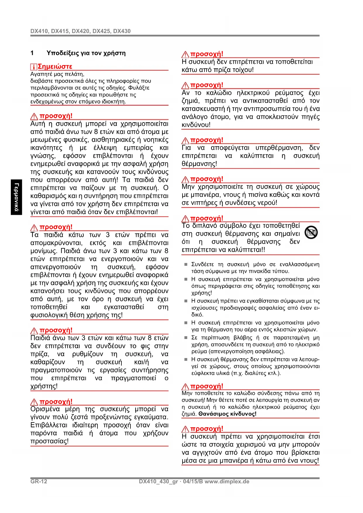 Η συσκευή πρέπει να χρησιμοποιείται έτσι ώστε τα στοιχεία χειρισμού να μην μπορούν να αγγιχτούν από ένα άτομο που βρίσκεται μέσα σε μια μπανιέρα ή κάτω από ένα ντους!www.dimplex.de DX410_430_gr · 04/15/B GR-13