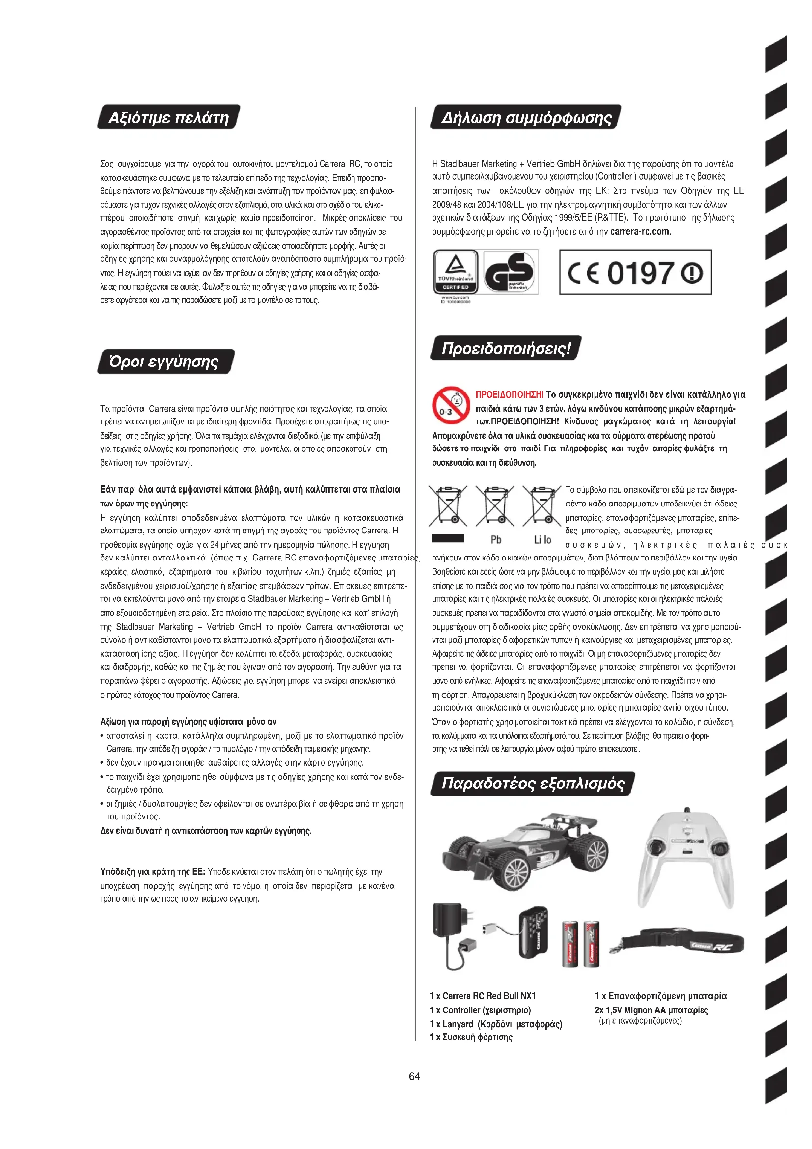 - Rengør RC-køretøjet efter brugen. Den aktuelste version af denne betjeningsvejledning og informationer om tilgængelige reservedele finder du på carrera-rc.com i serviceområdet. De to joysticks er aftagelige. Alternativt kan køretøjet styres med styrevipperne. Joystickene kan opbevares i det dertil beregnede rum på bagsiden af control- leren. Fastgør bærebåndet med karabinha- gen i øjet på controlleren og hæng den om halsen. Advarsler! Strangulationsfare!64 Αξιότιμε πελάτη Σας συγχαίρουμε για την αγορά του αυτοκινήτου μοντελισμού Carrera RC, το οποίο κατασκευάστηκε σύμφωνα με το τελευταίο επίπεδο της τεχνολογίας. Επειδή προσπα- θούμε πάντοτε να βελτιώνουμε την εξέλιξη και ανάπτυξη των προϊόντων μας, επιφυλασ- σόμαστε για τυχόν τεχνικές αλλαγές στον εξοπλισμό, στα υλικά και στο σχέδιο του ελικο- πτέρου οποιαδήποτε στιγμή και χωρίς καμία προειδοποίηση. Μικρές αποκλίσεις του αγορασθέντος προϊόντος από τα στοιχεία και τις φωτογραφίες αυτών των οδηγιών σε καμία περίπτωση δεν μπορούν να θεμελιώσουν αξιώσεις οποιασδήποτε μορφής. Αυτές οι οδηγίες χρήσης και συναρμολόγησης αποτελούν αναπόσπαστο συμπλήρωμα του προϊό- ντος. Η εγγύηση παύει να ισχύει αν δεν τηρηθούν οι οδηγίες χρήσης και οι οδηγίες ασφα- λείας που περιέχονται σε αυτές. Φυλάξτε αυτές τις οδηγίες για να μπορείτε να τις διαβά- σετε αργότερα και να τις παραδώσετε μαζί με το μοντέλο σε τρίτους. Όροι εγγύησης Τα προϊόντα Carrera είναι προϊόντα υψηλής ποιότητας και τεχνολογίας, τα οποία πρέπει να αντιμετωπίζονται με ιδιαίτερη φροντίδα. Προσέχετε απαραιτήτως τις υπο- δείξεις στις οδηγίες χρήσης. Όλα τα τεμάχια ελέγχονται διεξοδικά (με την επιφύλαξη για τεχνικές αλλαγές και τροποποιήσεις στα μοντέλα, οι οποίες αποσκοπούν στη βελτίωση των προϊόντων). Εάν παρ‘ όλα αυτά εφανιστεί κάποια βλάβη, αυτή καλύπτεται στα πλαίσια των όρων της εγγύησης: Η εγγύηση καλύπτει αποδεδειγμένα ελαττώματα των υλικών ή κατασκευαστικά ελαττώματα, τα οποία υπήρχαν κατά τη στιγμή της αγοράς του προϊόντος Carrera. Η προθεσμία εγγύησης ισχύει για 24 μήνες από την ημερομηνία πώλησης. Η εγγύηση δεν καλύπτει ανταλλακτικά (όπως π.χ. Carrera RC επαναφορτιζόμενες μπαταρίες, κεραίες, ελαστικά, εξαρτήματα του κιβωτίου ταχυτήτων κ.λπ.), ζημιές εξαιτίας μη ενδεδειγμένου χειρισμού/χρήσης ή εξαιτίας επεμβάσεων τρίτων. Επισκευές επιτρέπε- ται να εκτελούνται μόνο από την εταιρεία Stadlbauer Marketing + Vertrieb GmbH ή από εξουσιοδοτημένη εταιρεία. Στο πλαίσιο της παρούσας εγγύησης και κατ‘ επιλογή της Stadlbauer Marketing + Vertrieb GmbH το προϊόν Carrera αντικαθίσταται ως σύνολο ή αντικαθίστανται μόνο τα ελαττωματικά εξαρτήματα ή διασφαλίζεται αντι- κατάσταση ίσης αξίας. Η εγγύηση δεν καλύπτει τα έξοδα μεταφοράς, συσκευασίας και διαδρομής, καθώς και τις ζημιές που έγιναν από τον αγοραστή. Την ευθύνη για τα παραπάνω φέρει ο αγοραστής. Αξιώσεις για εγγύηση μπορεί να εγείρει αποκλειστικά ο πρώτος κάτοχος του προϊόντος Carrera. Αξίωση για παροχή εγγύησης υφίσταται όνο αν
