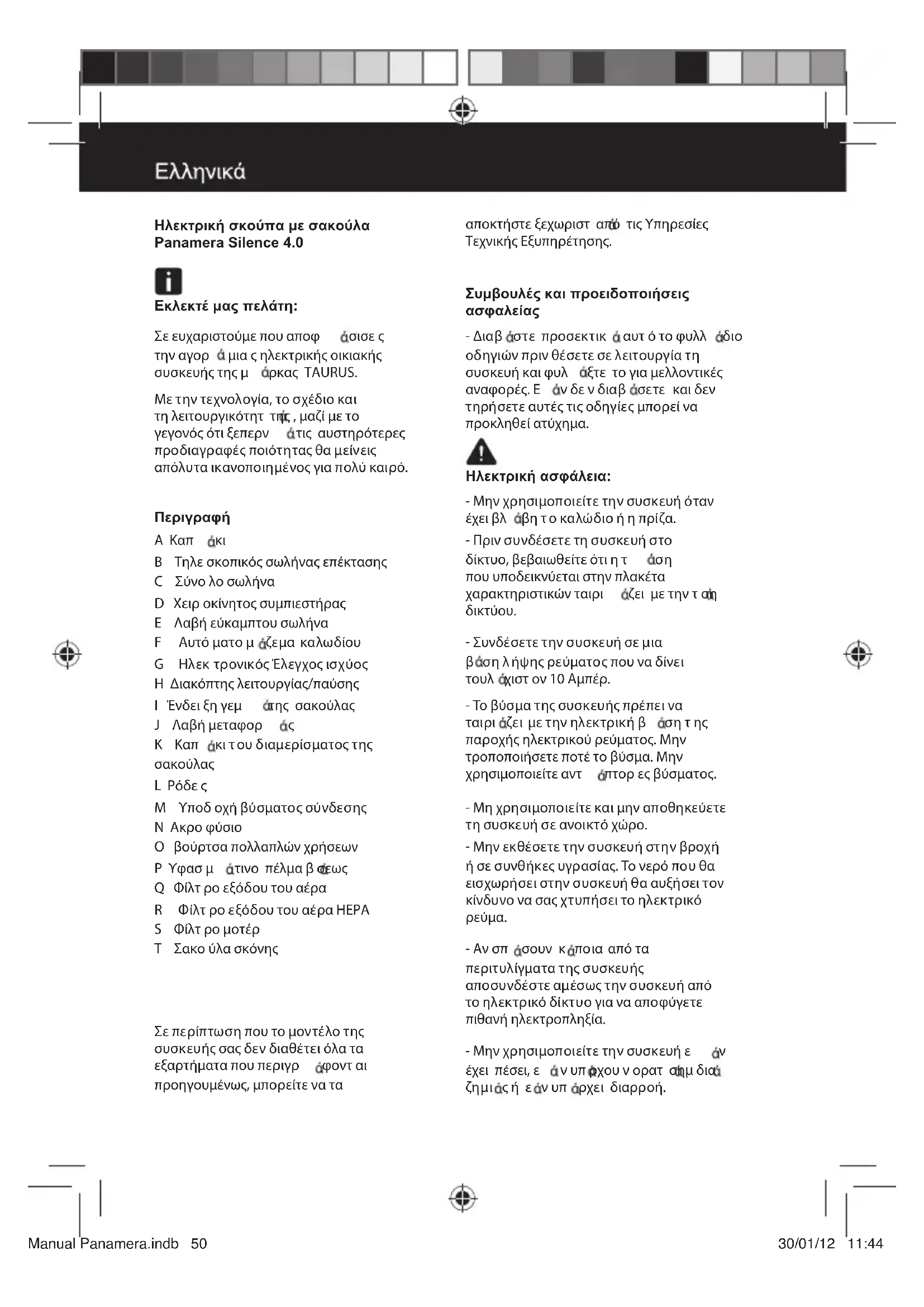 ς ή ε ν υπ ρχει διαρροή. Manual Panamera.indb 50 30/01/12 11:44- Μην χρησιμοποιείτε ποτέ το καλώδιο για να σηκώσετε, να μεταφέρετε ή να αποσυνδέσετε την συσκευή. - Ελέγξτε την κατσταση του ηλεκτρικού καλωδίου σύνδεσης. Τα ανακατωμένα καλώδια ή αυτ που έχουν βλβη αυξνουν τον κίνδυνο να σας χτυπήσει το ηλεκτρικό ρεύμα. - Μην αγγίζετε την πρίζα σύνδεσης με βρεγμένα χέρια. Χρήση και προσοχή: - Μην χρησιμοποιείτε την συσκευή χωρίς σωστ τοποθετημένο/α το/τα φίλτρο/α