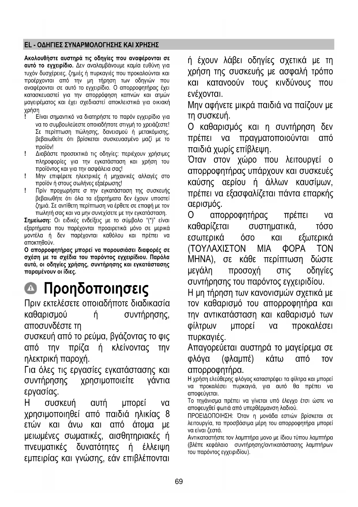 Μην αφήνετε μικρά παιδιά να παίζουν με τη συσκευή. Ο καθαρισμός και η συντήρηση δεν πρέπει να πραγματοποιούνται από παιδιά χωρίς επίβλεψη. Όταν στον χώρο που λειτουργεί ο απορροφητήρας υπάρχουν και συσκευές καύσης αερίου ή άλλων καυσίμων, πρέπει να εξασφαλίζεται πάντα επαρκής