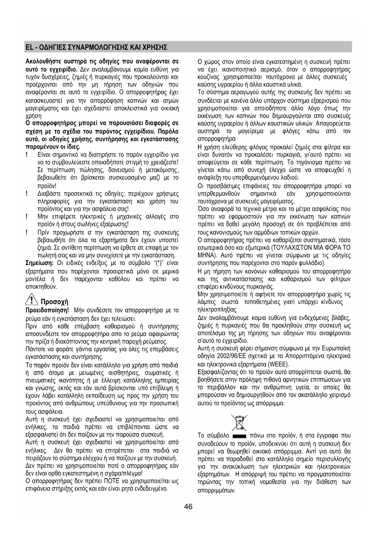 όσο και εξωτερικά (ΤΟΥΛΑΧΙΣΤΟΝ ΜΙΑ ΦΟΡΑ ΤΟ ΜΗΝΑ). Αυτό πρέπει να γίνεται σύμφωνα με τις οδηγίες συντήρησης που παρέχονται στο παρόν φυλλάδιο). Η μη τήρηση των κανόνων καθαρισμού του απορροφητήρα και της αντικατάστασης και καθαρισμού των φίλτρων επιφέρει κινδύνους πυρκαγιάς. Μην χρησιμοποιείτε ή αφήνετε τον απορροφητήρα χωρίς τις λάμπες σωστά τοποθετημένες γιατί υπάρχει κίνδυνος ηλεκτροπληξίας Δεν αναλαμβάνουμε καμια ευθύνη για ενδεχόμενες βλάβες, ζημιές ή πυρκαγιές που θα προκληθούν στην συσκευή ως αποτέλσμα της μη τήρησης των οδηγιών που αναφέρονται σ’αυτό το εγχειρίδιο. Αυτή η συσκευή φέρει σήμανση σύμφωνα με την Ευρωπαϊκή οδηγία 2002/96/ΕΕ σχετικά με τα Απορριπτόμενα ηλεκτρικά και ηλεκτρονικά εξαρτήματα (WEEE). Εξασφαλίζοντας ότι το προϊόν αυτό απορρίπτεται σωστά, θα βοηθήσετε στην πρόληψη πιθανά αρνητικών επιπτώσεων για το περιβάλλον και την ανθρώπινη υγεία, οι οποίες θα μπορούσαν να δημιουργηθούν από τον ακατάλληλο χειρισμό αυτού το προϊόντος ως απόρριμμα.