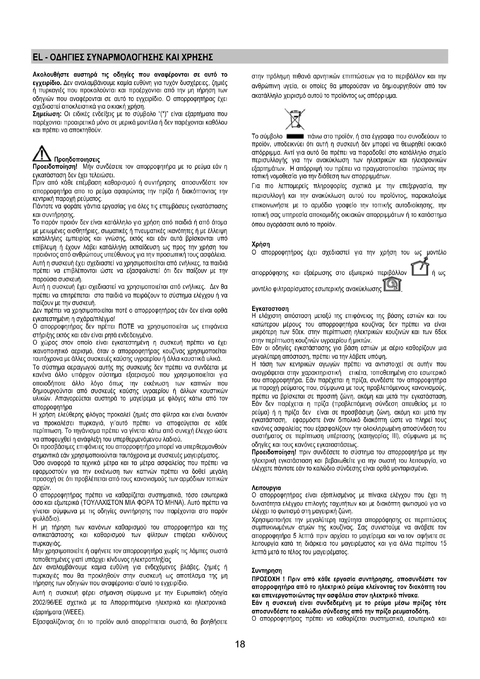 τοποθετημένες γιατί υπάρχει κίνδυνος ηλεκτροπληξίας Δεν αναλαμβάνουμε καμια ευθύνη για ενδεχόμενες βλάβες, ζημιές ή πυρκαγιές που θα προκληθούν στην συσκευή ως αποτέλσμα της μη τήρησης των οδηγιών που αναφέρονται σ’αυτό το εγχειρίδιο. Αυτή η συσκευή φέρει σήμανση σύμφωνα με την Ευρωπαϊκή οδηγία 2002/96/ΕΕ σχετικά με τα Απορριπτόμενα ηλεκτρικά και ηλεκτρονικά εξαρτήματα (WEEE). Εξασφαλίζοντας ότι το προϊόν αυτό απορρίπτεται σωστά, θα βοηθήσετε στην πρόληψη πιθανά αρνητικών επιπτώσεων για το περιβάλλον και την ανθρώπινη υγεία, οι οποίες θα μπορούσαν να δημιουργηθούν από τον ακατάλληλο χειρισμό αυτού το προϊόντος ως απόρριμμα.