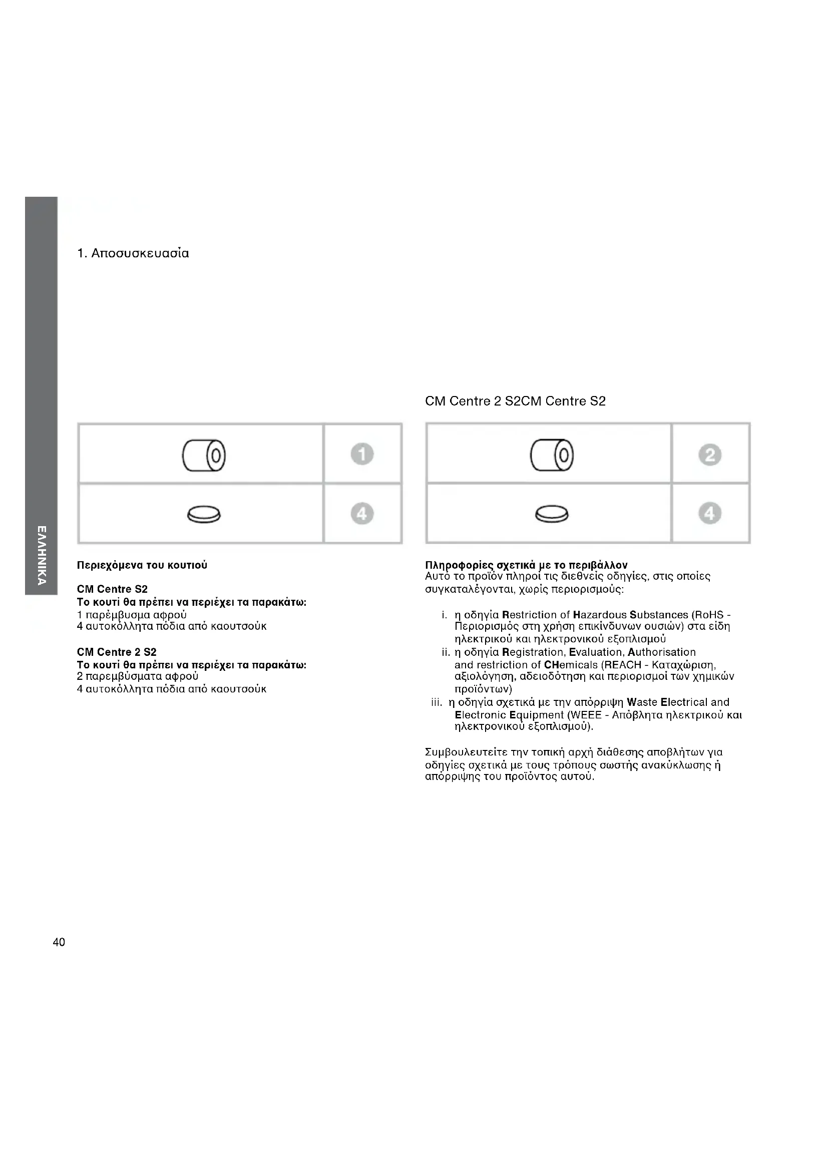 Περιεχόμενα του κουτιού CM Centre S2 Το κουτί θα πρέπει να περιέχει τα παρακάτω: 1 παρέμβυσμα αφρού 4 αυτοκόλλητα πόδια από καουτσούκ CM Centre 2 S2 Το κουτί θα πρέπει να περιέχει τα παρακάτω: 2 παρεμβύσματα αφρού 4 αυτοκόλλητα πόδια από καουτσούκ Πληροφορίες σχετικά με το περιβάλλον Αυτό το προϊόν πληροί τις διεθνείς οδηγίες, στις οποίες συγκαταλέγονται, χωρίς περιορισμούς: