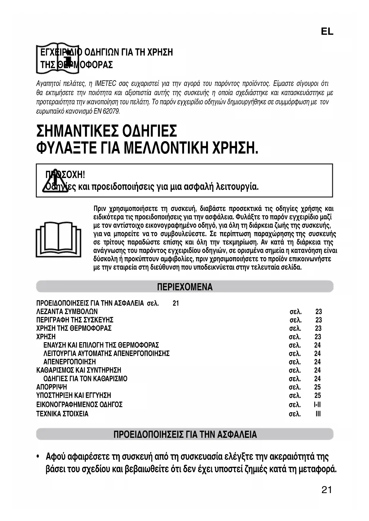 ΕΓΧΕΙΡΙΔΙΟ ΟΔΗΓΙΩΝ ΓΙΑ ΤΗ ΧΡΗΣΗ ΤΗΣ ΘΕΡΜΟΦΟΡΑΣ Αγαπητοί πελάτες, η IMETEC σας ευχαριστεί για την αγορά του παρόντος προϊόντος. Είμαστε σίγουροι ότι θα εκτιμήσετε την ποιότητα και αξιοπιστία αυτής της συσκευής η οποία σχεδιάστηκε και κατασκευάστηκε με προτεραιότητα την ικανοποίηση του πελάτη. Το παρόν εγχειρίδιο οδηγιών δημιουργήθηκε σε συμμόρφωση με τον ευρωπαϊκό κανονισμό EN 62079. ΣΗΜΑΝΤΙΚΕΣ ΟΔΗΓΙΕΣ ΦΥΛΑΞΤΕ ΓΙΑ ΜΕΛΛΟΝΤΙΚΗ ΧΡΗΣΗ.
