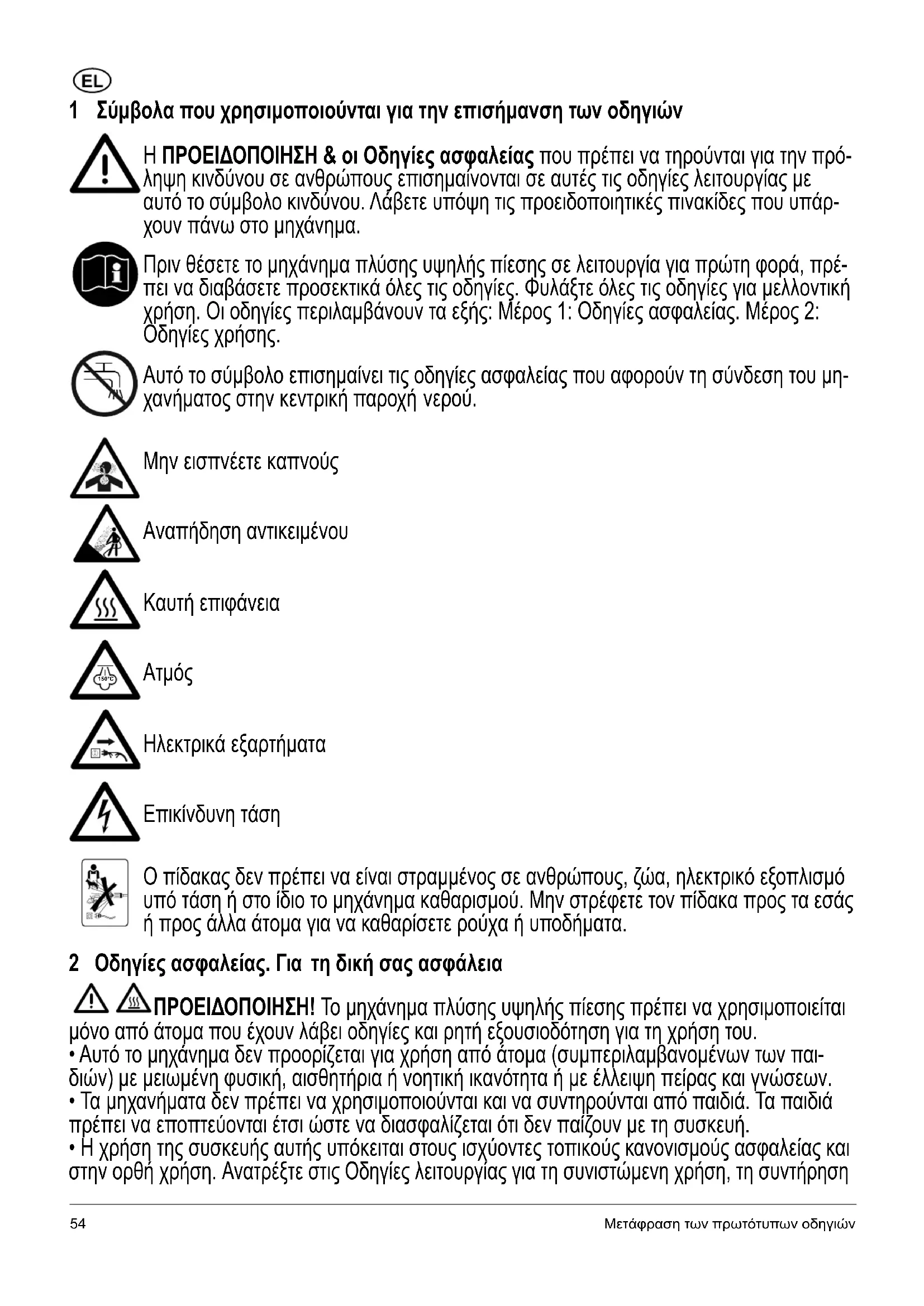 Ηλεκτρικά εξαρτήματα Επικίνδυνη τάση Ο πίδακας δεν πρέπει να είναι στραμμένος σε ανθρώπους, ζώα, ηλεκτρικό εξοπλισμό υπό τάση ή στο ίδιο το μηχάνημα καθαρισμού. Μην στρέφετε τον πίδακα προς τα εσάς ή προς άλλα άτομα για να καθαρίσετε ρούχα ή υποδήματα. 2 Οδηγίες ασφαλείας. Για τη δική σας ασφάλεια ΠΡΟΕΙΔΟΠΟΙΗΣΗ! Το μηχάνημα πλύσης υψηλής πίεσης πρέπει να χρησιμοποιείται μόνο από άτομα που έχουν λάβει οδηγίες και ρητή εξουσιοδότηση για τη χρήση του.