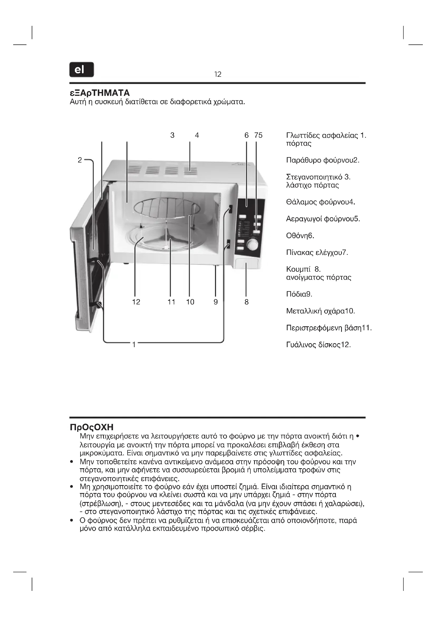 Παράθυρο φούρνου2. Στεγανοποιητικό 3. λάστιχο πόρτας Θάλαμος φούρνου4. Αεραγωγοί φούρνου5. Οθόνη6. Πίνακας ελέγχου7. Κουμπί 8. ανοίγματος πόρτας Πόδια9. Μεταλλική σχάρα10. Περιστρεφόμενη βάση11. Γυάλινος δίσκος12.
