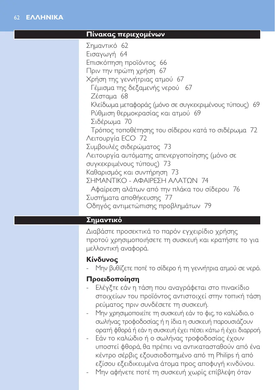 Temps de chauffe 126 Verrouillage du fer (certains modèles uniquement) 127 Température et réglage de la vapeur 128 Repassage 128 Mettre le fer sur son talon pendant le repassage 129 Mode ECO 130 Conseils pour le repassage 130 Mode Arrêt automatique (certains modèles uniquement) 131 Nettoyage et entretien 131 IMPORTANT - DÉTARTRAGE 131 Détartrer la semelle du fer 133 Rangement 135 Dépannage 136 -- N’utilisez pas l’appareil si la fiche, le cordon d’alimentation, le cordon d’arrivée de la vapeur ou l’appareil lui-même est endommagé, s’il est tombé ou s’il fuit. -- Si le cordon d’alimentation ou le cordon d’arrivée de la vapeur est endommagé, il doit être remplacé par Philips, par un Centre Service Agréé Philips ou par une personne qualifiée afin d’éviter tout accident. -- Ne laissez jamais l’appareil sans surveillance pendant qu’il est branché.
