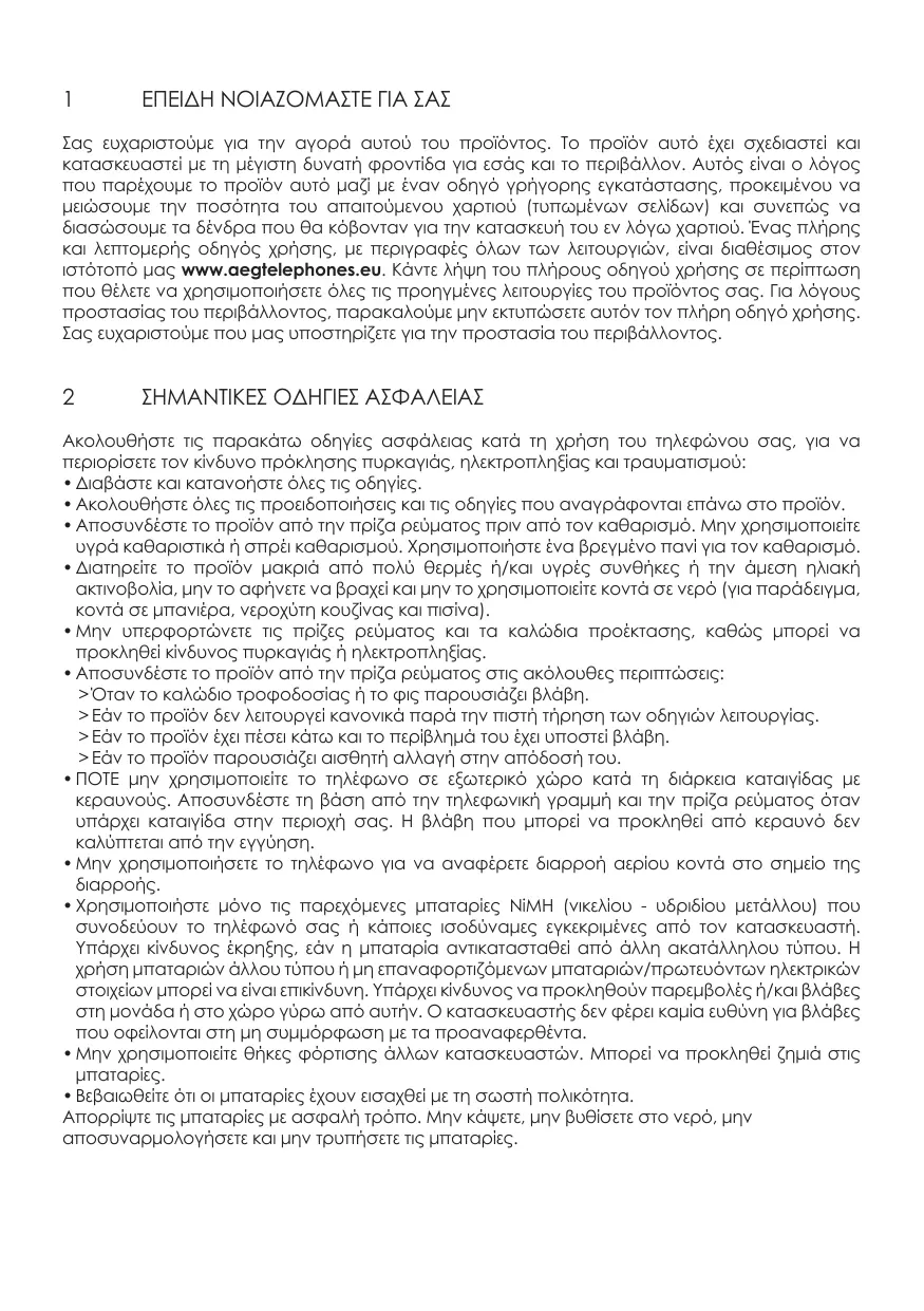 ΕΠΕΙΔΗ ΝΟΙΑΖΟΜΑΣΤΕ ΓΙΑ ΣΑΣ Σας ευχαριστούμε για την αγορά αυτού του προϊόντος. Το προϊόν αυτό έχει σχεδιαστεί και κατασκευαστεί με τη μέγιστη δυνατή φροντίδα για εσάς και το περιβάλλον. Αυτός είναι ο λόγος που παρέχουμε το προϊόν αυτό μαζί με έναν οδηγό γρήγορης εγκατάστασης, προκειμένου να μειώσουμε την ποσότητα του απαιτούμενου χαρτιού (τυπωμένων σελίδων) και συνεπώς να διασώσουμε τα δένδρα που θα κόβονταν για την κατασκευή του εν λόγω χαρτιού. Ένας πλήρης και λεπτομερής οδηγός χρήσης, με περιγραφές όλων των λειτουργιών, είναι διαθέσιμος στον ιστότοπό μας www.aegtelephones.eu. Κάντε λήψη του πλήρους οδηγού χρήσης σε περίπτωση που θέλετε να χρησιμοποιήσετε όλες τις προηγμένες λειτουργίες του προϊόντος σας. Για λόγους προστασίας του περιβάλλοντος, παρακαλούμε μην εκτυπώσετε αυτόν τον πλήρη οδηγό χρήσης. Σας ευχαριστούμε που μας υποστηρίζετε για την προστασία του περιβάλλοντος.