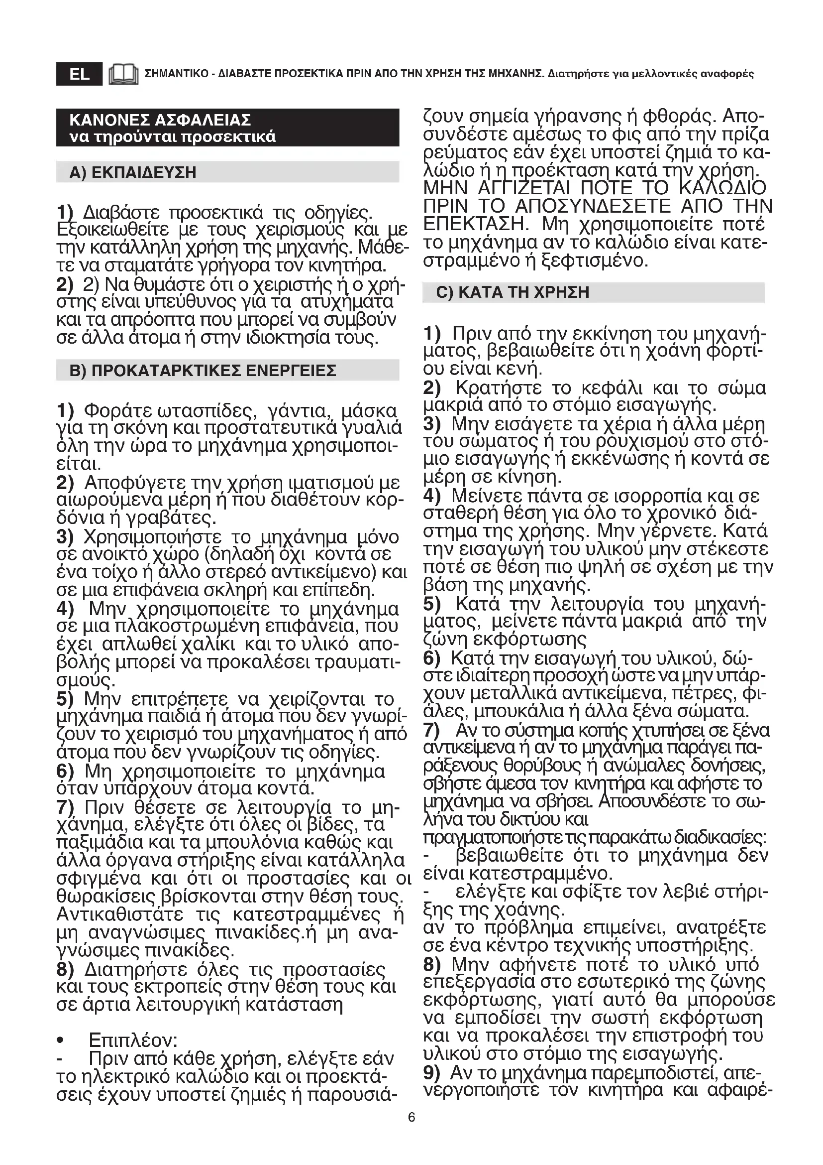 ΣΗΜΑΝΤΙΚΟ - ΔΙΑΒΑΣΤΕ ΠΡΟΣΕΚΤΙΚΑ ΠΡΙΝ ΑΠΟ ΤΗΝ ΧΡΗΣΗ ΤΗΣ ΜΗΧΑΝΗΣ. Διατηρήστε για μελλοντικές αναφορές ΚΑΝΟΝΕΣ ΑΣΦΑΛΕΙΑΣ να τηρούνται προσεκτικά A) ΕΚΠΑΙΔΕΥΣΗ