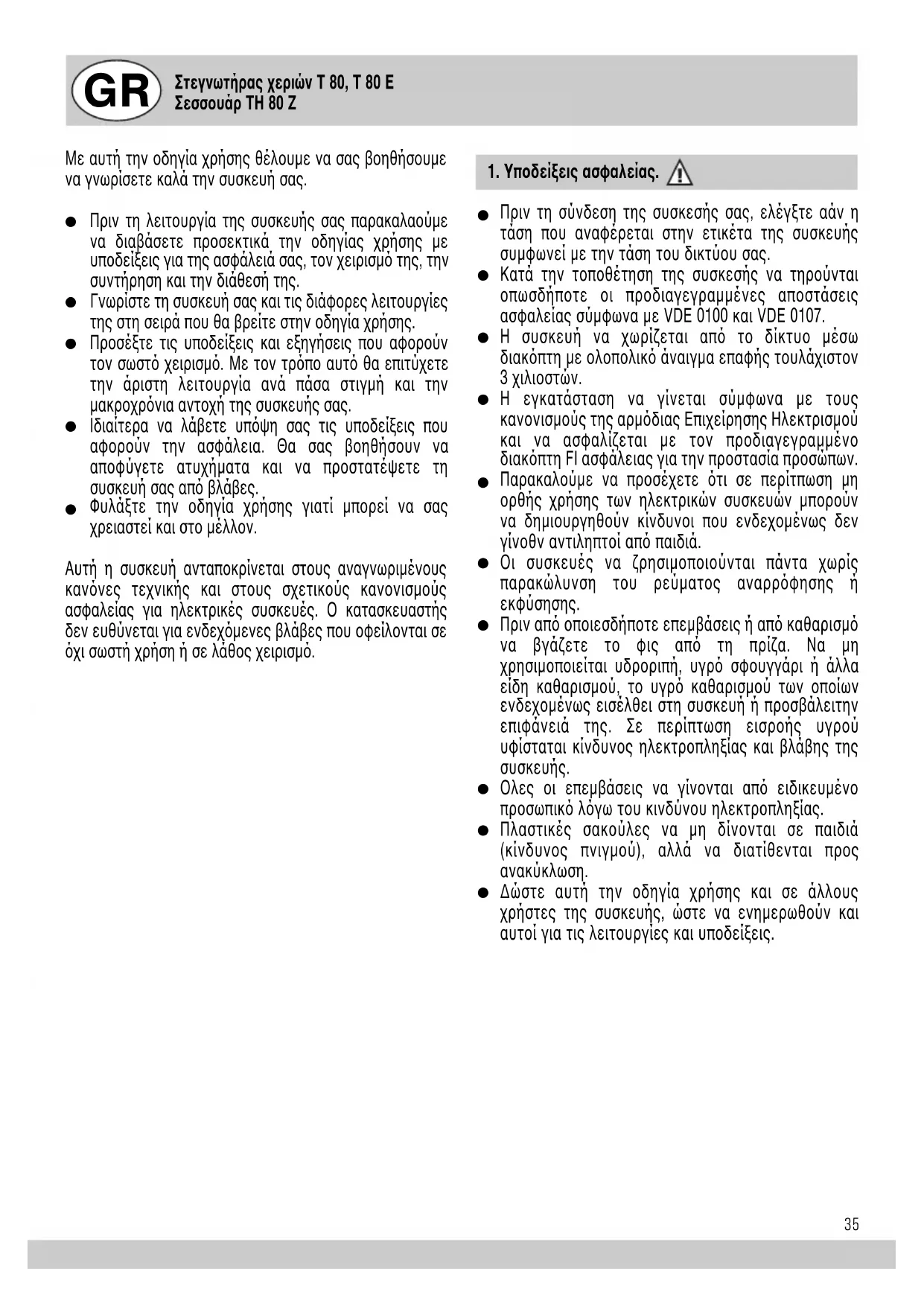 Κατεβάστε τις οδηγίες για το στεγνωτήρας χεριών σε μορφή PDF δωρεάν! Βρείτε το εγχειρίδιό σας T 80 - Starmix και πάρτε ξανά την ηλεκτρονική σας συσκευή στα χέρια σας. Σε αυτή τη σελίδα δημοσιεύονται όλα τα έγγραφα που απαιτούνται για τη χρήση της συσκευής σας. T 80 της μάρκας Starmix.
