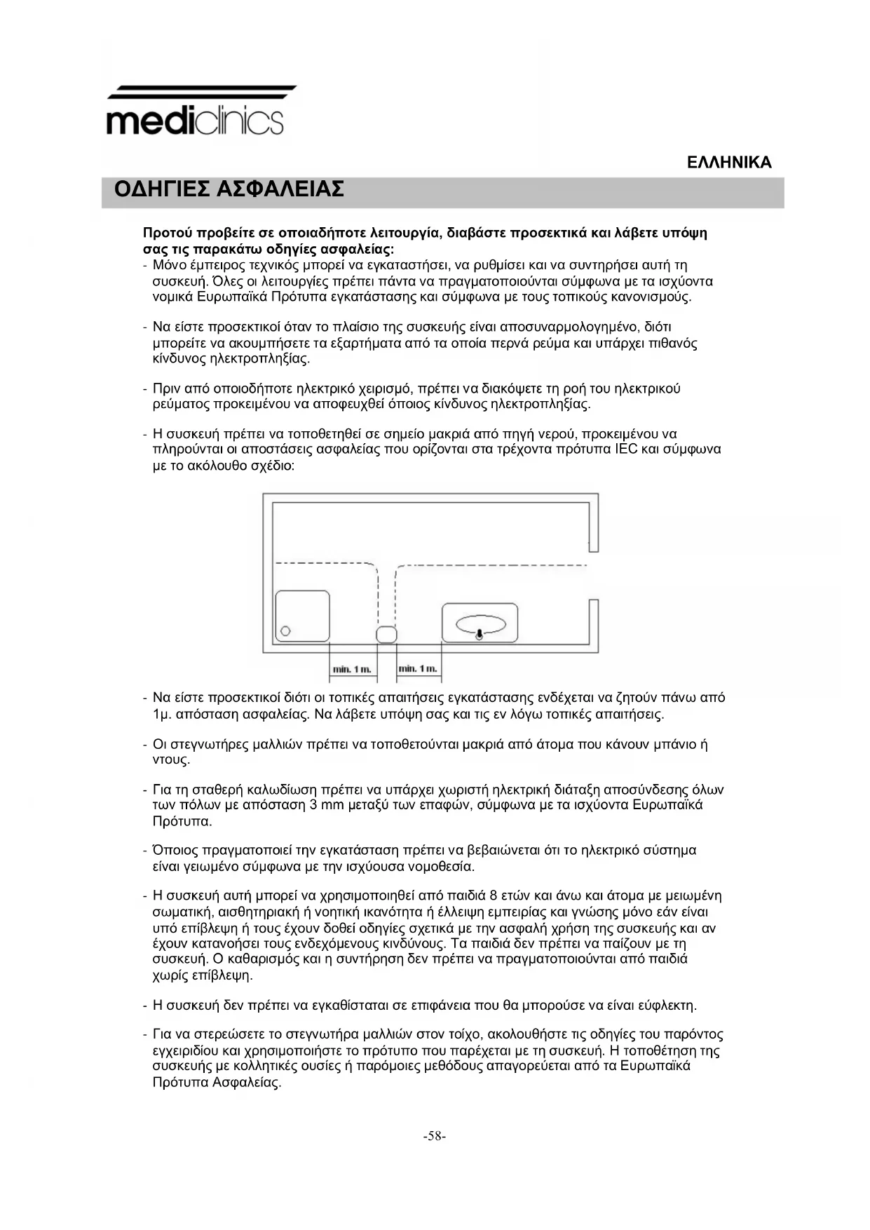Προτού προβείτε σε οποιαδήποτε λειτουργία, διαβάστε προσεκτικά και λάβετε υπόψη σας τις παρακάτω οδηγίες ασφαλείας: - Μόνο έμπειρος τεχνικός μπορεί να εγκαταστήσει, να ρυθμίσει και να συντηρήσει αυτή τη συσκευή. Όλες οι λειτουργίες πρέπει πάντα να πραγματοποιούνται σύμφωνα με τα ισχύοντα νομικά Ευρωπαϊκά Πρότυπα εγκατάστασης και σύμφωνα με τους τοπικούς κανονισμούς. - Να είστε προσεκτικοί όταν το πλαίσιο της συσκευής είναι αποσυναρμολογημένο, διότι μπορείτε να ακουμπήσετε τα εξαρτήματα από τα οποία περνά ρεύμα και υπάρχει πιθανός κίνδυνος ηλεκτροπληξίας. - Πριν από οποιοδήποτε ηλεκτρικό χειρισμό, πρέπει να διακόψετε τη ροή του ηλεκτρικού ρεύματος προκειμένου να αποφευχθεί όποιος κίνδυνος ηλεκτροπληξίας. - Η συσκευή πρέπει να τοποθετηθεί σε σημείο μακριά από πηγή νερού, προκειμένου να πληρούνται οι αποστάσεις ασφαλείας που ορίζονται στα τρέχοντα πρότυπα IEC και σύμφωνα με το ακόλουθο σχέδιο: - Να είστε προσεκτικοί διότι οι τοπικές απαιτήσεις εγκατάστασης ενδέχεται να ζητούν πάνω από 1μ. απόσταση ασφαλείας. Να λάβετε υπόψη σας και τις εν λόγω τοπικές απαιτήσεις. - Οι στεγνωτήρες μαλλιών πρέπει να τοποθετούνται μακριά από άτομα που κάνουν μπάνιο ή