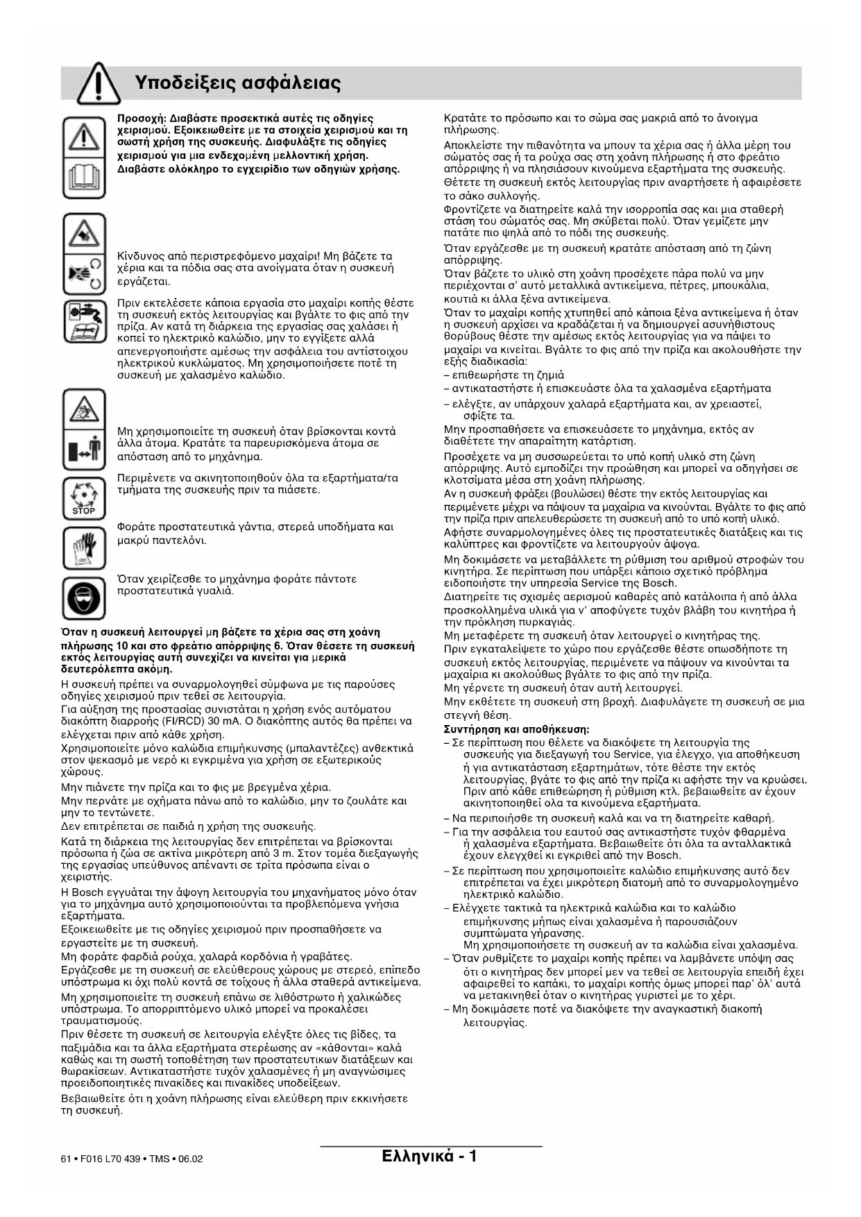 Μην προσπαθήσετε να επισκευάσετε το µηχάνηµα, εκτς αν διαθέτετε την απαραίτητη κατάρτιση. Προσέχετε να µη συσσωρεύεται το υπ κοπή υλικ στη ζώνη απρριψης. Αυτ εµποδίζει την προώθηση και µπορεί να οδηγήσει σε κλοτσίµατα µέσα στη χοάνη πλήρωσης. Αν η συσκευή φράξει (βουλώσει) θέστε την εκτς λειτουργίας και περιµένετε µέχρι να πάψουν τα µαχαίρια να κινούνται. Βγάλτε το φις απ την πρίζα πριν απελευθερώσετε τη συσκευή απ το υπ κοπή υλικ. Αφήστε συναρµολογηµένες λες τις προστατευτικές διατάξεις και τις καλύπτρες και φροντίζετε να λειτουργούν άψογα. Μη δοκιµάσετε να µεταβάλλετε τη ρύθµιση του αριθµού στροφών του κινητήρα. Σε περίπτωση που υπάρξει κάποιο σχετικ πρβληµα ειδοποιήστε την υπηρεσία Service της Bosch. ∆ιατηρείτε τις σχισµές αερισµού καθαρές απ κατάλοιπα ή απ άλλα προσκολληµένα υλικά για ν’ αποφύγετε τυχν βλάβη του κινητήρα ή την πρκληση πυρκαγιάς. Μη µεταφέρετε τη συσκευή ταν λειτουργεί ο κινητήρας της. Πριν εγκαταλείψετε το χώρο που εργάζεσθε θέστε οπωσδήποτε τη συσκευή εκτς λειτουργίας, περιµένετε να πάψουν να κινούνται τα µαχαίρια κι ακολούθως βγάλτε το φις απ την πρίζα. Μη γέρνετε τη συσκευή ταν αυτή λειτουργεί. Μην εκθέτετε τη συσκευή στη βροχή. ∆ιαφυλάγετε τη συσκευή σε µια στεγνή θέση. Συντήρηση και αποθήκευση: – Σε περίπτωση που θέλετε να διακψετε τη λειτουργία της συσκευής για διεξαγωγή του Service, για έλεγχο, για αποθήκευση ή για αντικατάσταση εξαρτηµάτων, ττε θέστε την εκτς λειτουργίας, βγάτε το φις απ την πρίζα κι αφήστε την να κρυώσει. Πριν απ κάθε επιθεώρηση ή ρύθµιση κτλ. βεβαιωθείτε αν έχουν ακινητοποιηθεί ολα τα κινούµενα εξαρτήµατα. – Να περιποιήσθε τη συσκευή καλά και να τη διατηρείτε καθαρή. – Για την ασφάλεια του εαυτού σας αντικαστήστε τυχν φθαρµένα ή χαλασµένα εξαρτήµατα. Βεβαιωθείτε τι λα τα ανταλλακτικά έχουν ελεγχθεί κι εγκριθεί απ την Bosch. – Σε περίπτωση που χρησιµοποιείτε καλώδιο επιµήκυνσης αυτ δεν επιτρέπεται να έχει µικρτερη διατοµή απ το συναρµολογηµένο ηλεκτρικ καλώδιο. – Ελέγχετε τακτικά τα ηλεκτρικά καλώδια και το καλώδιο επιµήκυνσης µήπως είναι χαλασµένα ή παρουσιάζουν συµπτώµατα γήρανσης. Μη χρησιµοποιήσετε τη συσκευή αν τα καλώδια είναι χαλασµένα. – *ταν ρυθµίζετε το µαχαίρι κοπής πρέπει να λαµβάνετε υπψη σας τι ο κινητήρας δεν µπορεί µεν να τεθεί σε λειτουργία επειδή έχει αφαιρεθεί το καπάκι, το µαχαίρι κοπής µως µπορεί παρ’ λ’ αυτά να µετακινηθεί ταν ο κινητήρας γυριστεί µε το χέρι. – Μη δοκιµάσετε ποτέ να διακψετε την αναγκαστική διακοπή λειτουργίας. Υποδείξεις ασφάλειας STOP F016 L70 439 - book.book Seite 1 Dienstag, 28. Februar 2006 7:57 07 61 • F016 L70 439 • TMS • 06.02Eλληνικά - 2