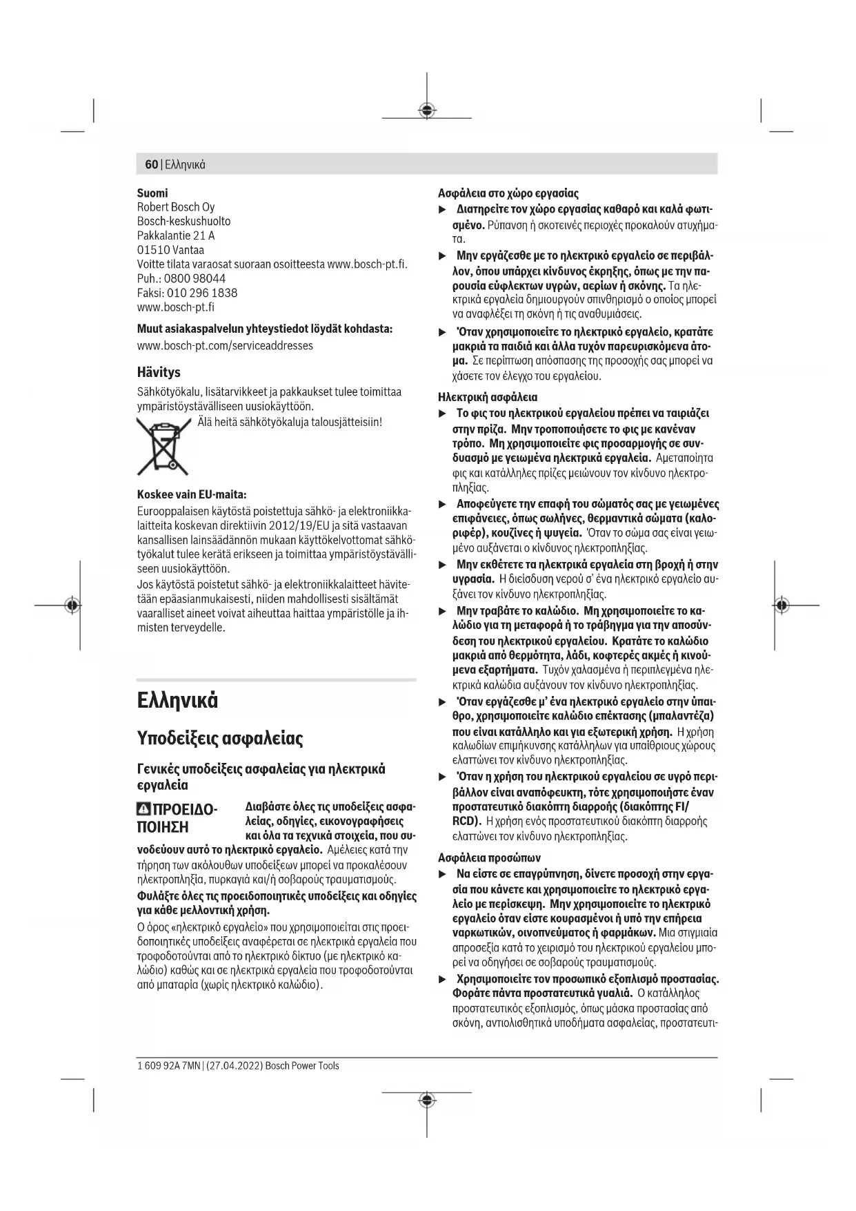 u Χρησιμοποιείτε τα ηλεκτρικά εργαλεία μόνο με τις ειδι- κά σχεδιασμένες μπαταρίες. Η χρήση άλλων μπαταριών μπορεί να οδηγήσει σε τραυματισμούς και να δημιουργήσει κίνδυνο πυρκαγιάς. u Όταν η μπαταρία δε χρησιμοποιείται, κρατήστε την μα- κριά από άλλα μεταλλικά αντικείμενα, όπως συνδετή- ρες χαρτιών, νομίσματα, κλειδιά, καρφιά, βίδες ή άλλα μικρά μεταλλικά αντικείμενα που μπορούν να βραχυκυ- κλώσουν τις επαφές της μπαταρίας. Ένα βραχυκύκλωμα των επαφών της μπαταρίας μπορεί να προκαλέσει τραυματι- σμούς ή φωτιά. u Μια τυχόν εσφαλμένη χρήση μπορεί να οδηγήσει σε διαρροή υγρών από την μπαταρία. Αποφεύγετε κάθε επαφή μ’ αυτά. Σε περίπτωση τυχαίας επαφής ξεπλύνε- τε καλά με νερό. Εάν τα υγρά έρθουν σε επαφή με τα μάτια, ζητήστε επιπλέον ιατρική βοήθεια. Διαρρέοντα υγρά μπαταρίας μπορεί να οδηγήσουν σε ερεθισμούς του δέρματος ή σε εγκαύματα. u Μην χρησιμοποιείτε μπαταρία ή εργαλείο που είναι κα- τεστραμμένο ή τροποποιημένο. Οι χαλασμένες ή τροπο- ποιημένες μπαταρίες μπορεί να παρουσιάσουν μια απρόβλεπτη συμπεριφορά και να οδηγήσουν σε φωτιά, έκρηξη ή σε κίνδυνο τραυματισμού. Bosch Power Tools 1 609 92A 7MN | (27.04.2022)62 | Ελληνικά u Μην εκθέτετε μια μπαταρία ή ένα εργαλείο μπαταρίας σε φωτιά ή σε πολύ υψηλές θερμοκρασίες. Η έκθεση στη φωτιά ή σε θερμοκρασία πάνω από τους 130 °C μπορεί να προκαλέσει έκρηξη. u Τηρείτε όλες τις υποδείξεις για τη φόρτιση και μη φορ- τίζετε την μπαταρία ή το εργαλείο μπαταρίας ποτέ εκτός της περιοχής θερμοκρασίας που αναφέρεται στις οδηγίες λειτουργίας. Η λάθος φόρτιση ή η φόρτιση εκτός της επιτρεπτής περιοχής θερμοκρασίας μπορεί να κατα- στρέψει την μπαταρία και να αυξήσει τον κίνδυνο πυρκα-