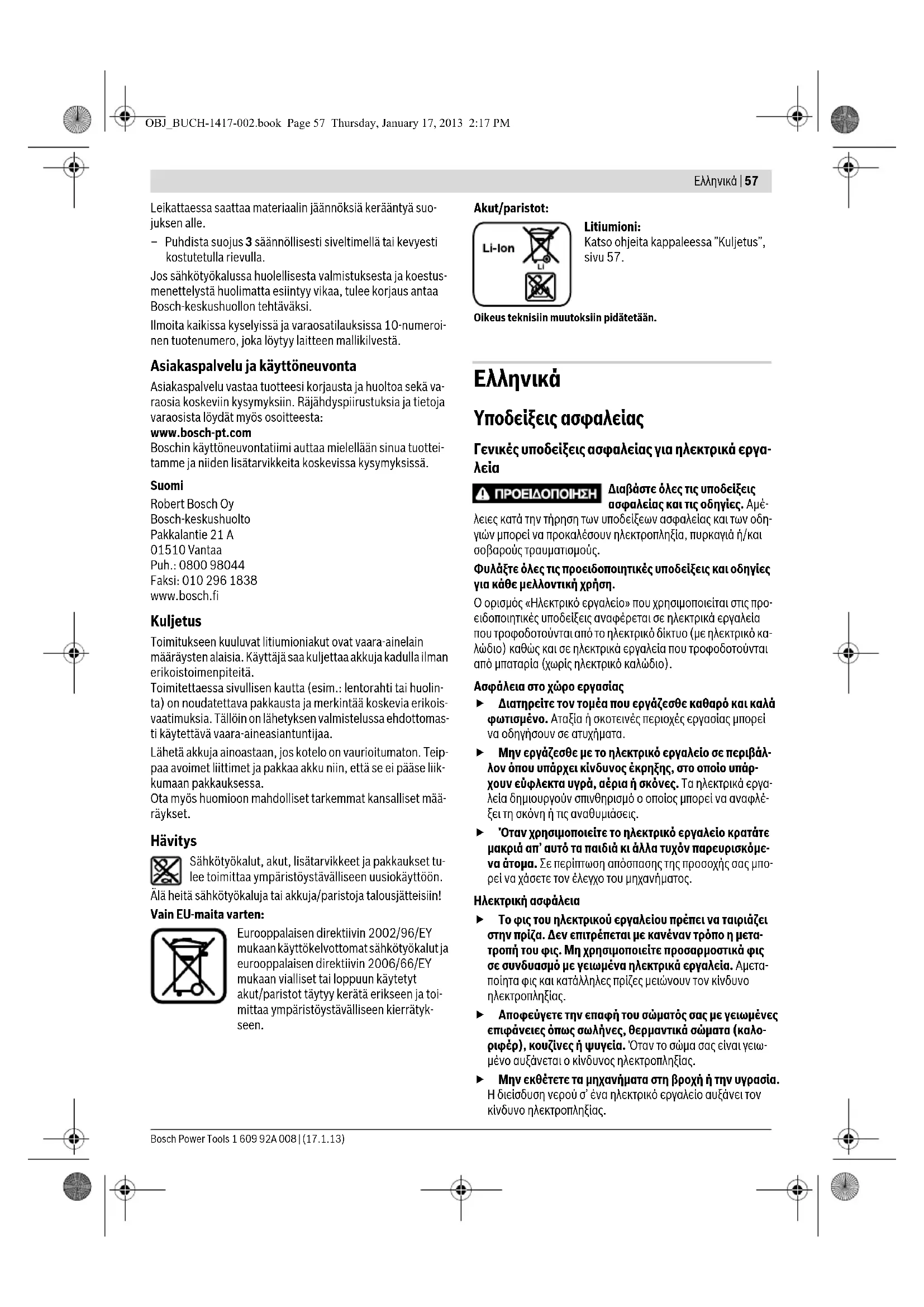 Χρησιμοποιείτε στα ηλεκτρικά εργαλεία μόνο μπαταρίες που προορίζονται γι’ αυτά. Η χρήση άλλων μπαταριών μπο- ρεί να οδηγήσει σε τραυματισμούς και να δημιουργήσει κίν- δυνο πυρκαγιάς. OBJ_BUCH-1417-002.book Page 58 Thursday, January 17, 2013 2:17 PMΕλληνικά | 59 Bosch Power Tools 1 609 92A 008 | (17.1.13) Κρατάτε τις μπαταρίες που δε χρησιμοποιείτε μακριά από συνδετήρες χαρτιών, νομίσματα, κλειδιά, καρφιά, βίδες κι άλλα μικρά μεταλλικά αντικείμενα που μπορούν να βραχυκυκλώσουν τις επαφές της μπαταρίας. Ένα βραχυκύκλωμα των επαφών της μπαταρίας μπορεί να προκα- λέσει τραυματισμούς ή φωτιά. Μια τυχόν εσφαλμένη χρήση μπορεί να οδηγήσει σε δι- αρροή υγρών από την μπαταρία. Αποφεύγετε κάθε επα- φή μ’ αυτά. Σε περίπτωση τυχαίας επαφής ξεπλύνετε κα- λά με νερό. Σε περίπτωση που τα υγρά θα έρθουν σε επα- φή με τα μάτια, πρέπει να ζητήσετε επίσης και ιατρική βοήθεια. Διαρρέοντα υγρά μπαταρίας μπορεί να οδηγήσουν σε ερεθισμούς του δέρματος ή σε εγκαύματα. Service Δώστε το ηλεκτρικό εργαλείο σας για επισκευή από άρι- στα εκπαιδευμένο προσωπικό και με γνήσια ανταλλακτι- κά. Έτσι εξασφαλίζετε τη διατήρηση της ασφάλειας του μη-