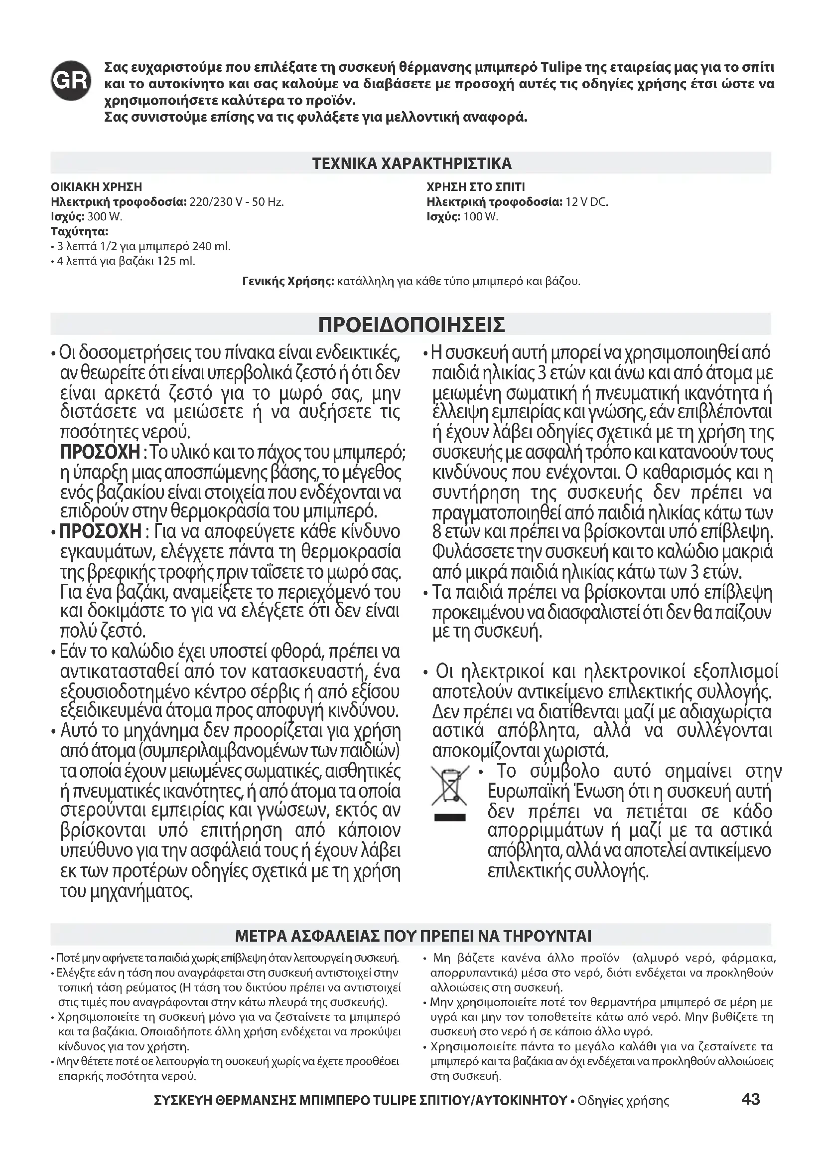 Σας ευχαριστούμε που επιλέξατε τη συσκευή θέρμανσης μπιμπερό Tulipe της εταιρείας μας για το σπίτι και το αυτοκίνητο και σας καλούμε να διαβάσετε με προσοχή αυτές τις οδηγίες χρήσης έτσι ώστε να χρησιμοποιήσετε καλύτερα το προϊόν. Σας συνιστούμε επίσης να τις φυλάξετε για μελλοντική αναφορά. ΠΡΟΕΙΔΟΠΟΙΗΣΕΙΣ