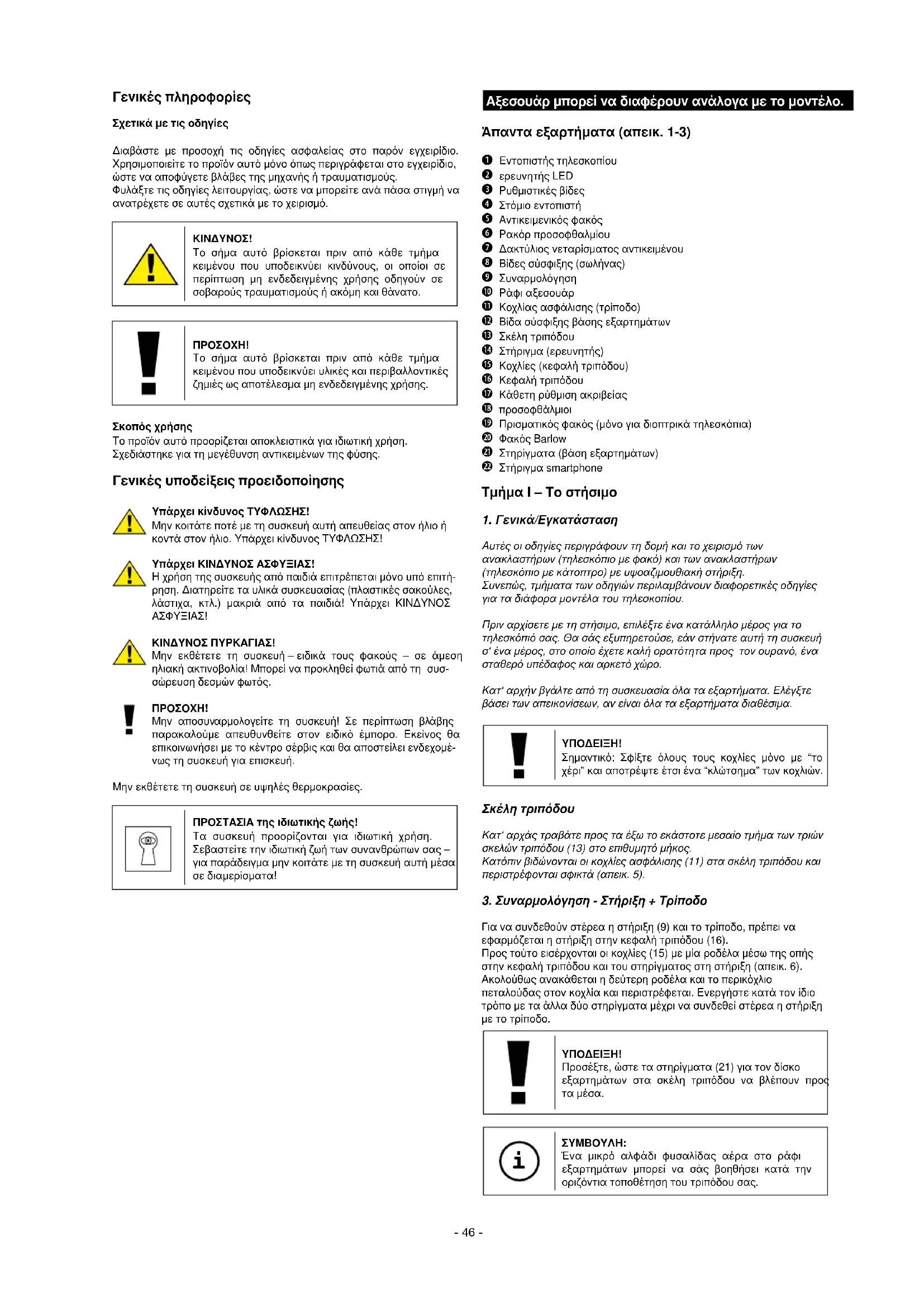 Το σήμα αυτό βρίσκεται πριν από κάθε τμήμα κειμένου που υποδεικνύει υλικές και περιβαλλοντικές ζημιές ως αποτέλεσμα μη ενδεδειγμένης χρήσης. Σκοπός χρήσης Το προϊόν αυτό προορίζεται αποκλειστικά για ιδιωτική χρήση. Σχεδιάστηκε για τη μεγέθυνση αντικειμένων της φύσης. Γενικές υποδείξεις προειδοποίησης Υπάρχει κίνδυνος ΤΥΦΛΩΣΗΣ! Μην κοιτάτε ποτέ με τη συσκευή αυτή απευθείας στον ήλιο ή κοντά στον ήλιο. Υπάρχει κίνδυνος ΤΥΦΛΩΣΗΣ! Υπάρχει ΚΙΝΔΥΝΟΣ ΑΣΦΥΞΙΑΣ! Η χρήση της συσκευής από παιδιά επιτρέπεται μόνο υπό επιτή- ρηση. Διατηρείτε τα υλικά συσκευασίας (πλαστικές σακούλες, λάστιχα, κτλ.) μακριά από τα παιδιά! Υπάρχει ΚΙΝΔΥΝΟΣ