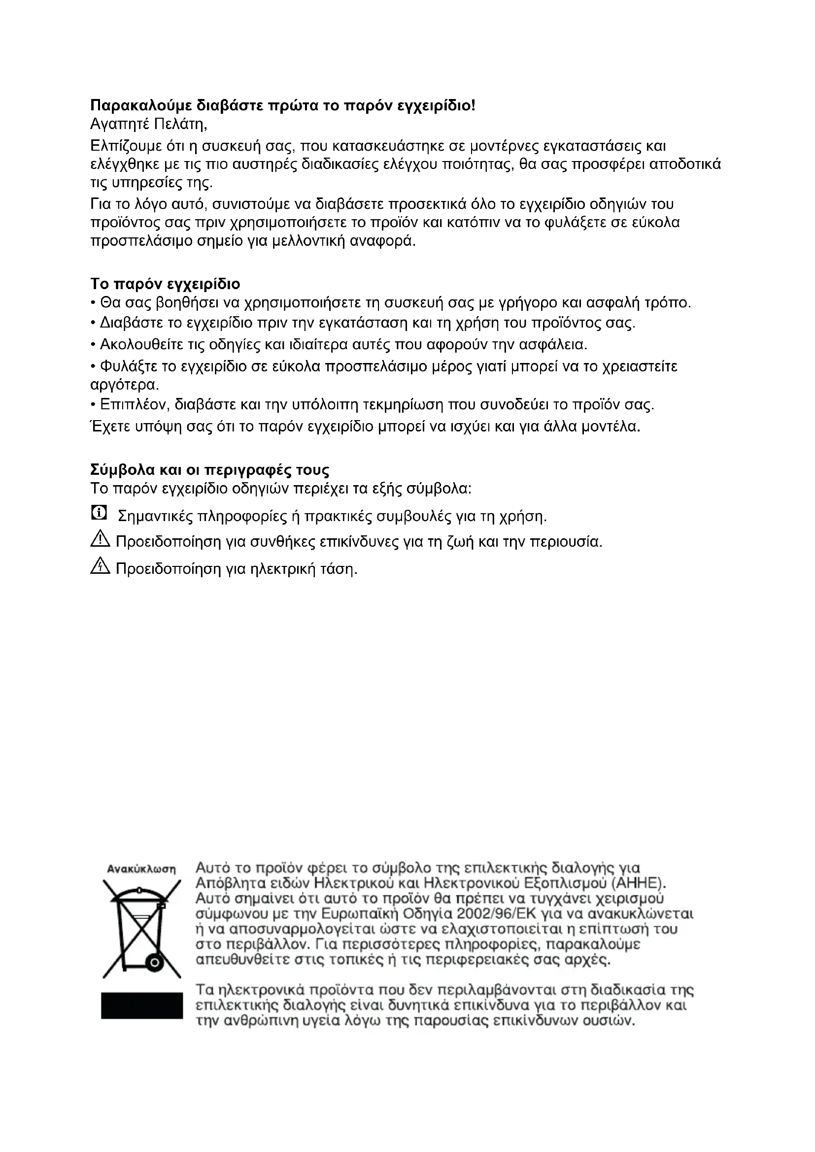 με ταινίες κατάλληλου πάχους και γερά σχοινιά και θα πρέπει να ακολουθούνται οι κανόνες μεταφοράς που είναι τυπωμένοι στο κιβώτιο. Μην ξεχνάτε... Κάθε υλικό που ανακυκλώνεται είναι μια απαραίτητη πηγή υλικών προς όφελος της φύσης και των εθνικών μας πόρων. Αν επιθυμείτε να συμβάλετε στην ανακύκλωση των υλικών συσκευασίας, μπορείτε να πάρετε περισσότερες πληροφορίες από τους περιβαλλοντικούς φορείς ή τις τοπικές αρχές. Πριν θέσετε σε λειτουργία το