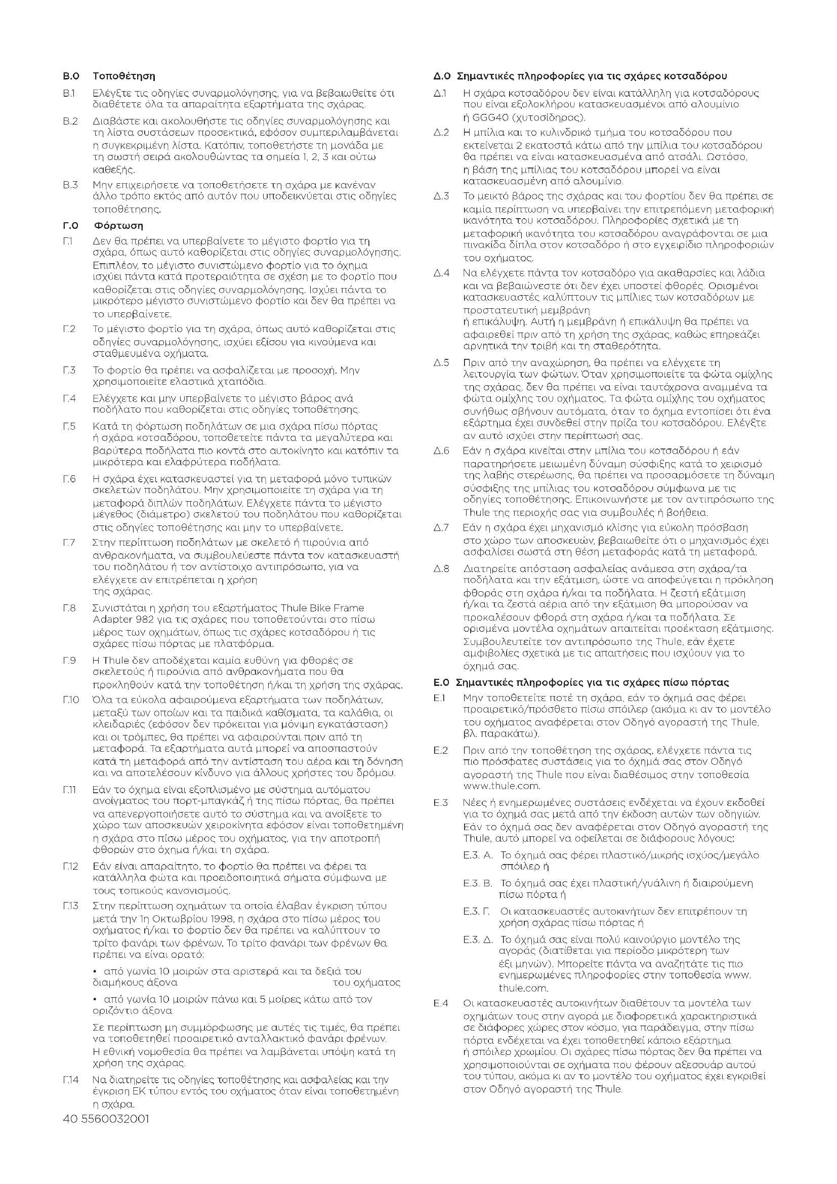 Δ.0 Σημαντικές πληροφορίες για τις σχάρες κοτσαδόρου Δ.1 Η σχάρα κοτσαδόρου δεν είναι κατάλληλη για κοτσαδόρους που είναι εξολοκλήρου κατασκευασμένοι από αλουμίνιο ήGGG40 (χυτοσίδηρος). Δ.2 Η μπίλια και το κυλινδρικό τμήμα του κοτσαδόρου που εκτείνεται 2 εκατοστά κάτω από την μπίλια του κοτσαδόρου θα πρέπει να είναι κατασκευασμένα από ατσάλι. Ωστόσο, η βάση της μπίλιας του κοτσαδόρου μπορεί να είναι κατασκευασμένη από αλουμίνιο. Δ.3 Το μεικτό βάρος της σχάρας και του φορτίου δεν θα πρέπει σε καμία περίπτωση να υπερβαίνει την επιτρεπόμενη μεταφορική ικανότητα του κοτσαδόρου. Πληροφορίες σχετικά με τη μεταφορική ικανότητα του κοτσαδόρου αναγράφονται σε μια πινακίδα δίπλα στον κοτσαδόρο ή στο εγχειρίδιο πληροφοριών του οχήματος. Δ.4 Να ελέγχετε πάντα τον κοτσαδόρο για ακαθαρσίες και λάδια και να βεβαιώνεστε ότι δεν έχει υποστεί φθορές. Ορισμένοι κατασκευαστές καλύπτουν τις μπίλιες των κοτσαδόρων με προστατευτική μεμβράνη ή επικάλυψη. Αυτή η μεμβράνη ή επικάλυψη θα πρέπει να αφαιρεθεί πριν από τη χρήση της σχάρας, καθώς επηρεάζει αρνητικά την τριβή και τη σταθερότητα. Δ.5 Πριν από την αναχώρηση, θα πρέπει να ελέγχετε τη λειτουργία των φώτων. Όταν χρησιμοποιείτε τα φώτα ομίχλης της σχάρας, δεν θα πρέπει να είναι ταυτόχρονα αναμμένα τα φώτα ομίχλης του οχήματος. Τα φώτα ομίχλης του οχήματος συνήθως σβήνουν αυτόματα, όταν το όχημα εντοπίσει ότι ένα εξάρτημα έχει συνδεθεί στην πρίζα του κοτσαδόρου. Ελέγξτε αν αυτό ισχύει στην περίπτωσή σας. Δ.6 Εάν η σχάρα κινείται στην μπίλια του κοτσαδόρου ή εάν παρατηρήσετε μειωμένη δύναμη σύσφιξης κατά το χειρισμό της λαβής στερέωσης, θα πρέπει να προσαρμόσετε τη δύναμη σύσφιξης της μπίλιας του κοτσαδόρου σύμφωνα με τις οδηγίες τοποθέτησης. Επικοινωνήστε με τον αντιπρόσωπο της Thule της περιοχής σας για συμβουλές ή βοήθεια. Δ.7 Εάν η σχάρα έχει μηχανισμό κλίσης για εύκολη πρόσβαση στο χώρο των αποσκευών, βεβαιωθείτε ότι ο μηχανισμός έχει ασφαλίσει σωστά στη θέση μεταφοράς κατά τη μεταφορά. Δ.8 Διατηρείτε απόσταση ασφαλείας ανάμεσα στη σχάρα/τα ποδήλατα και την εξάτμιση, ώστε να αποφεύγεται η πρόκληση φθοράς στη σχάρα ή/και τα ποδήλατα. Η ζεστή εξάτμιση ή/και τα ζεστά αέρια από την εξάτμιση θα μπορούσαν να προκαλέσουν φθορά στη σχάρα ή/και τα ποδήλατα. Σε ορισμένα μοντέλα οχημάτων απαιτείται προέκταση εξάτμισης. Συμβουλευτείτε τον αντιπρόσωπο της Thule, εάν έχετε αμφιβολίες σχετικά με τις απαιτήσεις που ισχύουν για το