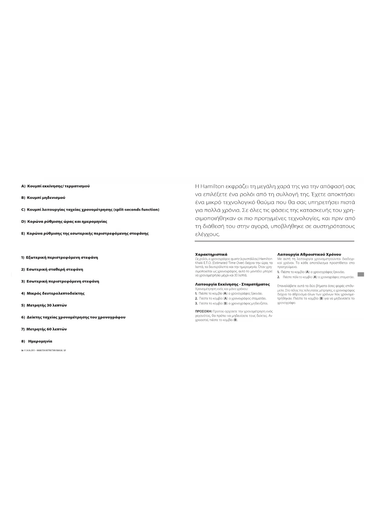 κόκκινο τόξο πάνω στην εξωτερική περιστρεφόμενη στεφάνη (1) = 17,5 mph. Ρύθμιση της ζώνης ώρας και της ημερομηνίας Αφού τραβήξετε προς τα έξω την κορώνα (D) στην ενδιάμεση θέση της (1), μπορείτε να ρυθμίσετε τον ωροδείκτη προς τα εμπρός ή προς τα πίσω χωρίς να επηρεαστούν οι ρυθμίσεις των λεπτοδείκτη και του δευ- τερολεπτοδείκτη. Η ημερομηνία διορθώνεται κάθε φορά που ο ωροδείκτης περνάει από την ώρα 12 τα μεσάνυχτα. ΠΡΟΣΟΧΗ: Οι κορώνες (D) και (E) είναι βιδωμένες προς τα κάτω για να διασφαλίζεται έτσι η βέλτιστη αδιαβροχοποίηση. Θα πρέπει να τις ξεβιδώσετε για να χρησιμοποιήσετε τις αντίστοιχες λειτουργίες τους. Μην ξεχάσετε να τις ξαναβιδώσετε αφού τις χρησιμοποιήσετε για οποιεσδήποτε λειτουργίες. Ρύθμιση της ώρας Όταν η κορώνα (D) βρίσκεται στη θέση (2), τότε σταμα- τούν όλοι οι δείκτες του ρολογιού – περιλαμβανομένου και του δευτερολεπτοδείκτη – και μπορείτε να ρυθμίσετε τον ωροδείκτη και τον λεπτοδείκτη όπως επιθυμείτε. Επαναρύθμιση του χρονογράφου (Εάν οι δείκτες δεν βρίσκονται ακριβώς στη θέση μηδέν.) Ενόσω περιστρέφεται ένας δείκτης του χρονογράφου, πιέστε το κομβίο (A) για να σταματήσετε το χρονο- γράφο και κατόπιν πιέστε το κομβίο (B): τότε οι δείκτες επιστρέφουν στην θέση εκκίνησης. Εάν οι δείκτες δεν επι- στρέψουν ακριβώς στη θέση μηδέν, τότε ο κάθε δείκτης μπορεί να ρυθμιστεί στη θέση μηδέν ως εξής: Μετρητής των 30 λεπτών Με την κορώνα (D) στη θέση 1: Πιέστε το κομβίο (A) Μετρητής των 60 δευτερολέπτων (λευκός δείκτης – δείκτης ταχείας χρονομέτρησης) Με την κορώνα (D) στη θέση 2: Πιέστε το κομβίο (A) Μετρητής των 60 δευτερολέπτων (κόκκινος δείκτης – δευτερολεπτοδείκτης του καντράν) Με την κορώνα (D) στη θέση 2: Πιέστε το κομβίο (B) Παρατήρηση: Οι δείκτες ενδέχεται να προχωρούν ταχύτερα αν κρατάτε πιεσμένο το κομβίο πάνω από ένα δευτερόλεπτο. Προσοχή: Να μην αφήνετε την κορώνα στη θέση 1 πάνω από 20 λεπτά, διότι αυτό θα μπορούσε να δημιουργήσει προβλήματα στη λειτουργία μέτρησης της ώρας.62 © 24.06.2013 – HAMILTON INSTRUCTION MANUAL 63 Фирма Hamilton рада, что Вы выбрали одну из моделей ее коллекции. Вы приобрели маленькое чудо техники, которое будет верно служить Вам долгие годы. Хронограф изготовлен с использованием самых передовых достижений техники и прошел строжайший предпродажный контроль. Характеристики В качестве часов кварцевый хронограф Hamilton Khaki E.T.O. (Estimated Time Over) показывает часы, минуты, секунды и текущую дату. В качестве хронографа эта модель может хронометрировать события продол- жительностью до 30 минут. Функция «старт-стоп» (Start-Stop) Хронометраж отдельного события: