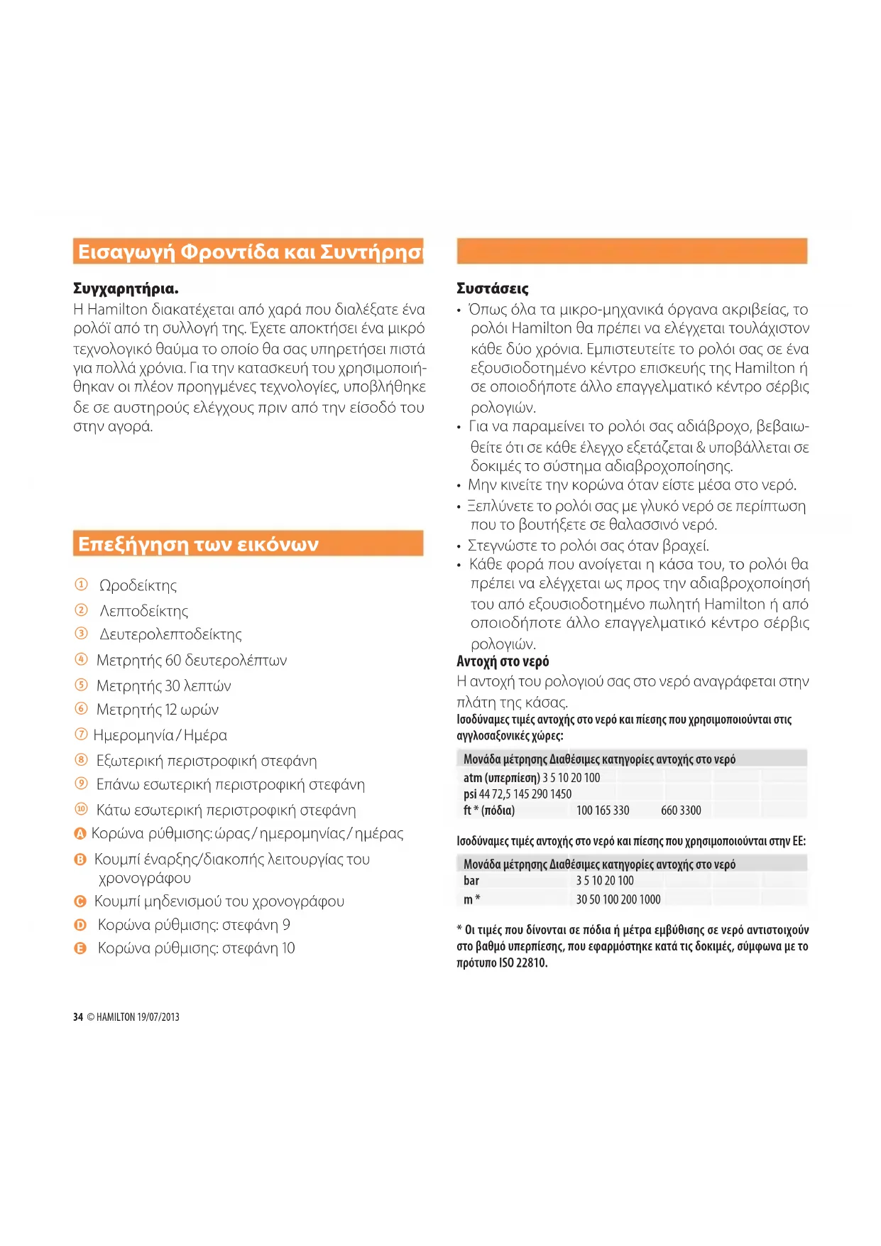 - Οι τιμές που δίνονται σε πόδια ή μέτρα εμβύθισης σε νερό αντιστοιχούν στο βαθμό υπερπίεσης, που εφαρμόστηκε κατά τις δοκιμές, σύμφωνα με το πρότυπο ISO 22810.INSTRUCTION MANUAL 35 Δερμάτινα λουράκια Η Hamilton σας συνιστά να ακολουθήσετε τα παρακάτω βήματα προκειμένου το δερμάτινο λουράκι να διατηρη- θεί σε καλή κατάσταση όσο το δυνατόν περισσότερο: