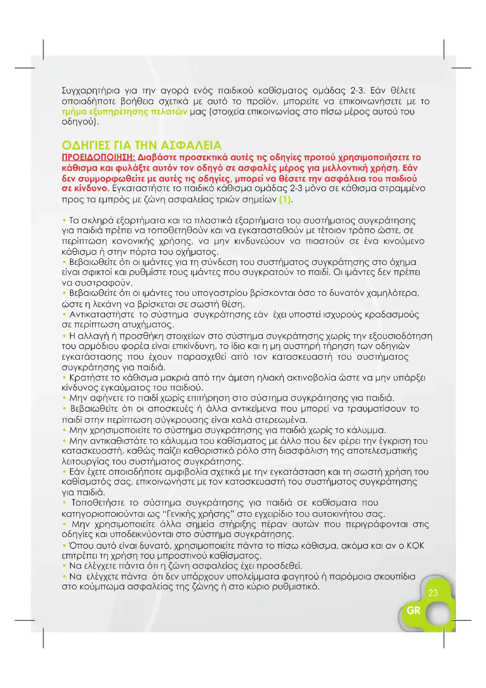 - Εάν έχετε οποιαδήποτε αμφιβολία σχετικά με την εγκατάσταση και τη σωστή χρήση του καθίσματός σας, επικοινωνήστε με τον κατασκευαστή του συστήματος συγκράτησης για παιδιά.
