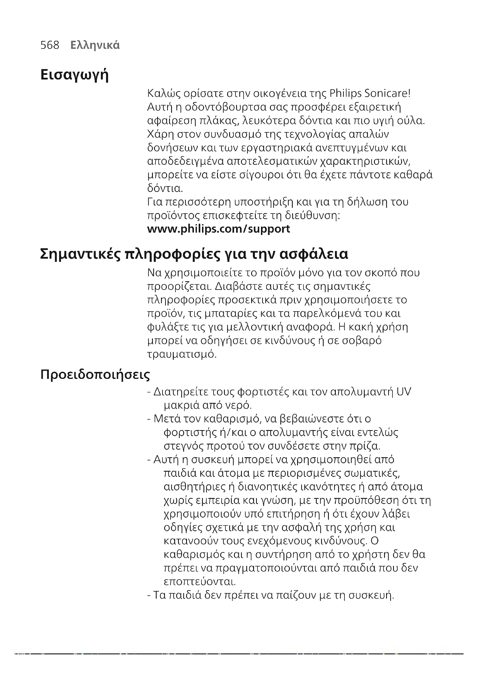 Για περισσότερη υποστήριξη και για τη δήλωση του προϊόντος επισκεφτείτε τη διεύθυνση: www.philips.com/support Σημαντικές πληροφορίες για την ασφάλεια Να χρησιμοποιείτε το προϊόν μόνο για τον σκοπό που προορίζεται. Διαβάστε αυτές τις σημαντικές πληροφορίες προσεκτικά πριν χρησιμοποιήσετε το προϊόν, τις μπαταρίες και τα παρελκόμενά του και φυλάξτε τις για μελλοντική αναφορά. Η κακή χρήση μπορεί να οδηγήσει σε κινδύνους ή σε σοβαρό τραυματισμό. Προειδοποιήσεις - Διατηρείτε τους φορτιστές και τον απολυμαντή UV μακριά από νερό. - Μετά τον καθαρισμό, να βεβαιώνεστε ότι ο φορτιστής ή/και ο απολυμαντής είναι εντελώς στεγνός προτού τον συνδέσετε στην πρίζα. - Αυτή η συσκευή μπορεί να χρησιμοποιηθεί από παιδιά και άτομα με περιορισμένες σωματικές, αισθητήριες ή διανοητικές ικανότητες ή από άτομα χωρίς εμπειρία και γνώση, με την προϋπόθεση ότι τη χρησιμοποιούν υπό επιτήρηση ή ότι έχουν λάβει οδηγίες σχετικά με την ασφαλή της χρήση και κατανοούν τους ενεχόμενους κινδύνους. Ο καθαρισμός και η συντήρηση από το χρήστη δεν θα πρέπει να πραγματοποιούνται από παιδιά που δεν εποπτεύονται. - Τα παιδιά δεν πρέπει να παίζουν με τη συσκευή.569