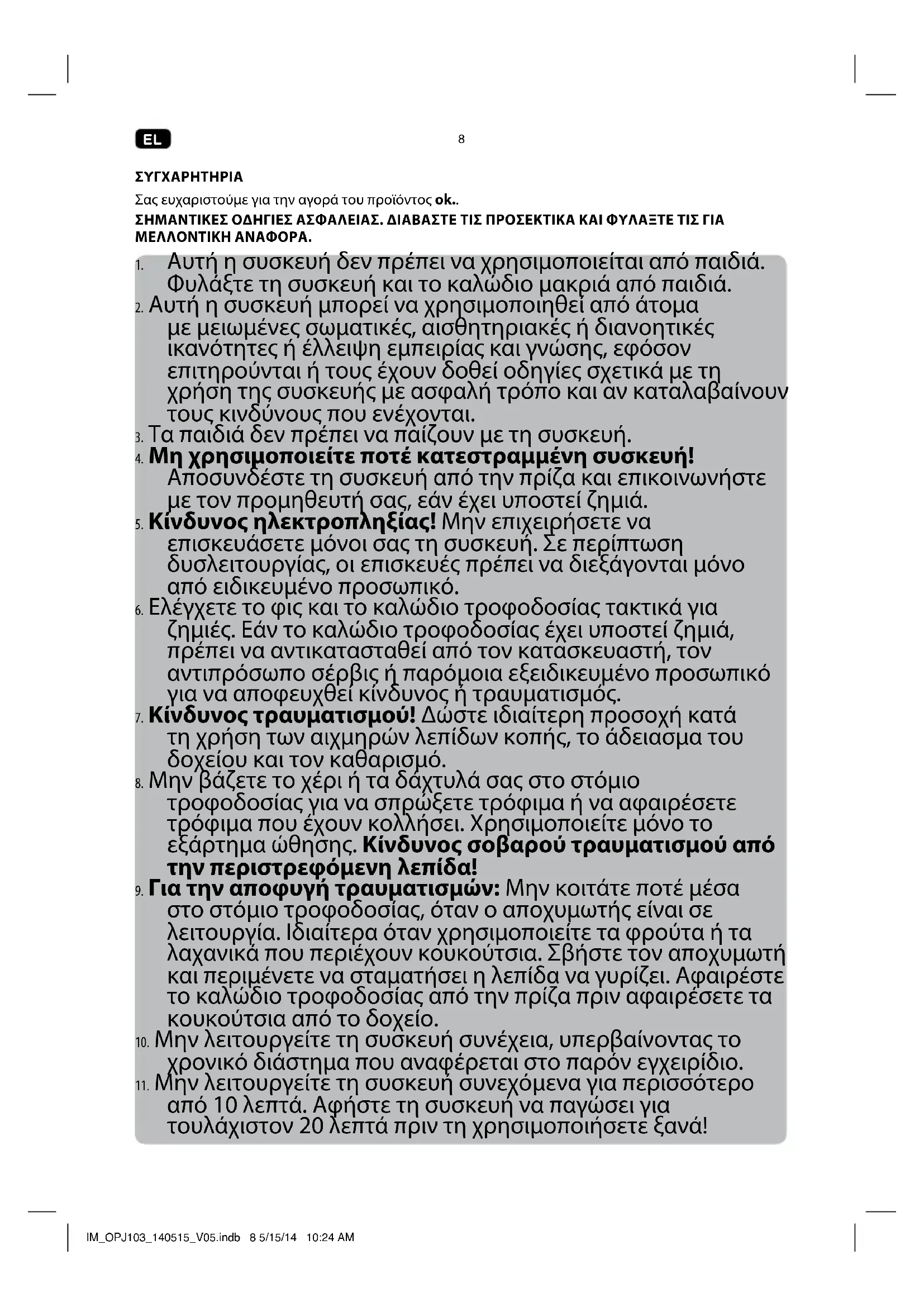 ΠΡΟΟΡΙΖΟΜΕΝΗ ΧΡΗΣΗ Αυτή η συσκευή προορίζεται μόνο για την παρασκευή χυμών. Αυτή η συσκευή είναι κατάλληλη μόνο για ιδιωτική οικιακή χρήση και δεν έχει σχεδιαστεί για εμπορική χρήση. Οποιαδήποτε άλλη χρήση μπορεί να προκαλέσει βλάβη στη συσκευή ή τραυματισμό. ΠΡΙΝ ΤΗΝ ΠΡΤΗ ΧΡΗΣΗ