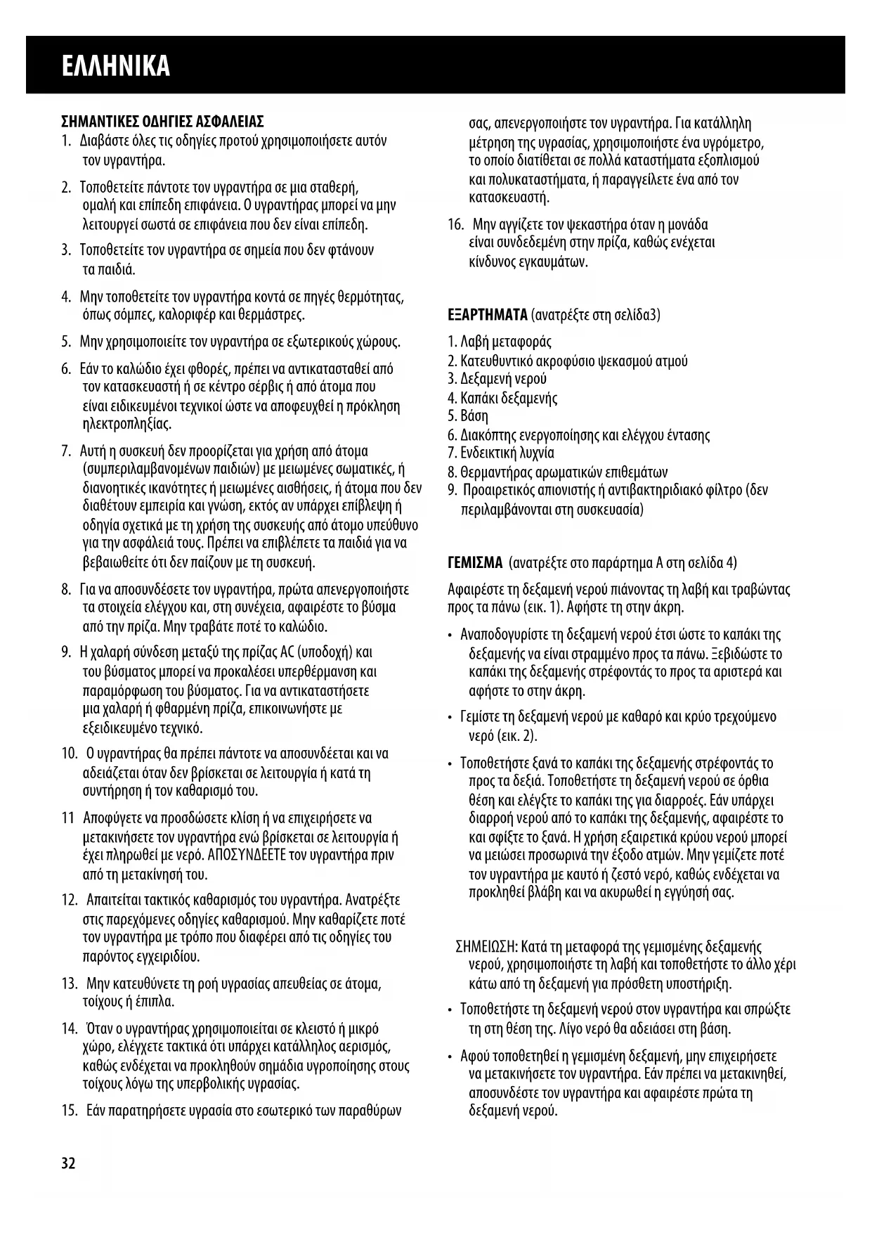 - Αφού τοποθετηθεί η γεμισμένη δεξαμενή, μην επιχειρήσετε να μετακινήσετε τον υγραντήρα. Εάν πρέπει να μετακινηθεί, αποσυνδέστε τον υγραντήρα και αφαιρέστε πρώτα τη δεξαμενή νερού.33 EΛΛHNIKA ΠΡΩΤΗ ΧΡΗΣΗ Πριν από τη χρήση της μονάδας για πρώτη φορά, θα πρέπει να λάβετε υπόψη τα εξής:
