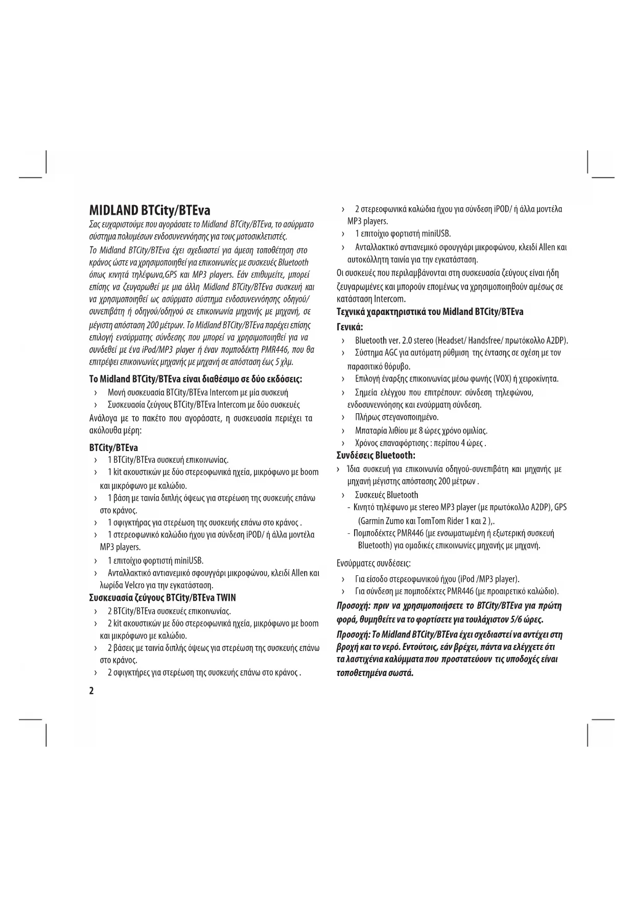- λειτουργίες συσκευής MIDLAND BTCity/BTEva Σας ευχαριστούμε που αγοράσατε το Midland BTCity/BTEva, το ασύρματο σύστημα πολυμέσων ενδοσυνεννόησης για τους μοτοσικλετιστές. Το Midland BTCity/BTEva έχει σχεδιαστεί για άμεση τοποθέτηση στο κράνος ώστε να χρησιμοποιηθεί για επικοινωνίες με συσκευές Bluetooth όπως κινητά τηλέφωνα,GPS και MP3 players. Εάν επιθυμείτε, μπορεί επίσης να ζευγαρωθεί με μια άλλη Midland BTCity/BTEva συσκευή και να χρησιμοποιηθεί ως ασύρματο σύστημα ενδοσυνεννόησης οδηγού/ συνεπιβάτη ή οδηγού/οδηγού σε επικοινωνία μηχανής με μηχανή, σε μέγιστη απόσταση 200 μέτρων. Το Midland BTCity/BTEva παρέχει επίσης επιλογή ενσύρματης σύνδεσης που μπορεί να χρησιμοποιηθεί για να συνδεθεί με ένα iPod/MP3 player ή έναν πομποδέκτη PMR446, που θα επιτρέψει επικοινωνίες μηχανής με μηχανή σε απόσταση έως 5 χλμ. Το Midland BTCity/BTEva είναι διαθέσιμο σε δύο εκδόσεις: › Μονή συσκευασία BTCity/BTEva Intercom με μία συσκευή › Συσκευασία ζεύγους BTCity/BTEva Intercom με δύο συσκευές Ανάλογα με το πακέτο που αγοράσατε, η συσκευασία περιέχει τα ακόλουθα μέρη: BTCity/BTEva › 1 BTCity/BTEva συσκευή επικοινωνίας. › 1 kit ακουστικών με δύο στερεοφωνικά ηχεία, μικρόφωνο με boom και μικρόφωνο με καλώδιο. › 1 βάση με ταινία διπλής όψεως για στερέωση της συσκευής επάνω στο κράνος. › 1 σφιγκτήρας για στερέωση της συσκευής επάνω στο κράνος . › 1 στερεοφωνικό καλώδιο ήχου για σύνδεση iPOD/ ή άλλα μοντέλα MP3 players. › 1 επιτοίχιο φορτιστή miniUSB. › Ανταλλακτικό αντιανεμικό σφουγγάρι μικροφώνου, κλειδί Allen και λωρίδα Velcro για την εγκατάσταση. Συσκευασία ζεύγους BTCity/BTEva TWIN › 2 BTCity/BTEva συσκευές επικοινωνίας. › 2 kit ακουστικών με δύο στερεοφωνικά ηχεία, μικρόφωνο με boom και μικρόφωνο με καλώδιο. › 2 βάσεις με ταινία διπλής όψεως για στερέωση της συσκευής επάνω στο κράνος. › 2 σφιγκτήρες για στερέωση της συσκευής επάνω στο κράνος . › 2 στερεοφωνικά καλώδια ήχου για σύνδεση iPOD/ ή άλλα μοντέλα MP3 players. › 1 επιτοίχιο φορτιστή miniUSB. › Ανταλλακτικό αντιανεμικό σφουγγάρι μικροφώνου, κλειδί Allen και αυτοκόλλητη ταινία για την εγκατάσταση. Οι συσκευές που περιλαμβάνονται στη συσκευασία ζεύγους είναι ήδη ζευγαρωμένες και μπορούν επομένως να χρησιμοποιηθούν αμέσως σε κατάσταση Intercom. Τεχνικά χαρακτηριστικά του Midland BTCity/BTEva p. 162