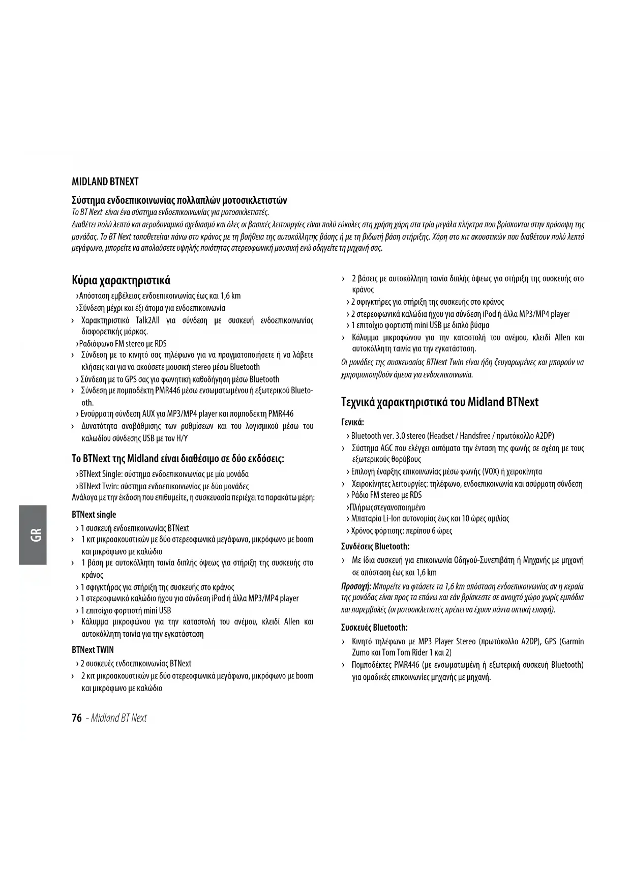 MIDLAND BTNEXT Σύστημα ενδοεπικοινωνίας πολλαπλών μοτοσικλετιστών Το BT Next είναι ένα σύστημα ενδοεπικοινωνίας για μοτοσικλετιστές. Διαθέτει πολύ λεπτό και αεροδυναμικό σχεδιασμό και όλες οι βασικές λειτουργίες είναι πολύ εύκολες στη χρήση χάρη στα τρία μεγάλα πλήκτρα που βρίσκονται στην πρόσοψη της μονάδας. Το BT Next τοποθετείται πάνω στο κράνος με τη βοήθεια της αυτοκόλλητης βάσης ή με τη βιδωτή βάση στήριξης. Χάρη στο κιτ ακουστικών που διαθέτουν πολύ λεπτό μεγάφωνο, μπορείτε να απολαύσετε υψηλής ποιότητας στερεοφωνική μουσική ενώ οδηγείτε τη μηχανή σας. Κύρια χαρακτηριστικά › Απόσταση εμβέλειας ενδοεπικοινωνίας έως και 1,6 km › Σύνδεση μέχρι και έξι άτομα για ενδοεπικοινωνία › Χαρακτηριστικό Talk2All για σύνδεση με συσκευή ενδοεπικοινωνίας διαφορετικής μάρκας. › Ραδιόφωνο FM stereo με RDS › Σύνδεση με το κινητό σας τηλέφωνο για να πραγματοποιήσετε ή να λάβετε κλήσεις και για να ακούσετε μουσική stereo μέσω Bluetooth › Σύνδεση με το GPS σας για φωνητική καθοδήγηση μέσω Bluetooth › Σύνδεση με πομποδέκτη PMR446 μέσω ενσωματωμένου ή εξωτερικού Blueto- oth. › Ενσύρματη σύνδεση AUX για MP3/ΜΡ4 player και πομποδέκτη PMR446 › Δυνατότητα αναβάθμισης των ρυθμίσεων και του λογισμικού μέσω του καλωδίου σύνδεσης USB με τον Η/Υ Το BTNext της Midland είναι διαθέσιμο σε δύο εκδόσεις: › BTNext Single: σύστημα ενδοεπικοινωνίας με μία μονάδα › BTNext Twin: σύστημα ενδοεπικοινωνίας με δύο μονάδες Ανάλογα με την έκδοση που επιθυμείτε, η συσκευασία περιέχει τα παρακάτω μέρη: BTNext single › 1 συσκευή ενδοεπικοινωνίας BTNext › 1 κιτ μικροακουστικών με δύο στερεοφωνικά μεγάφωνα, μικρόφωνο με boom και μικρόφωνο με καλώδιο › 1 βάση με αυτοκόλλητη ταινία διπλής όψεως για στήριξη της συσκευής στο