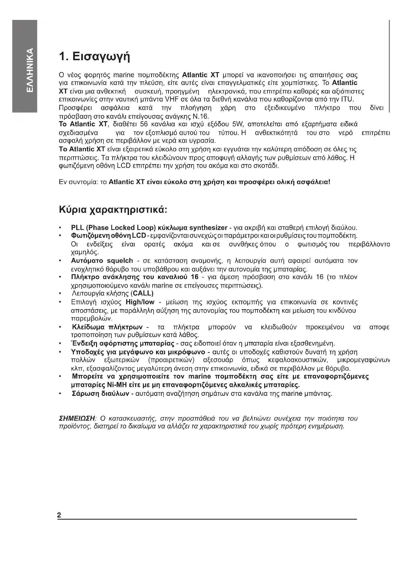 Ο νέος φορητός marine πομποδέκτης Atlantic XT μπορεί να ικανοποιήσει τις απαιτήσεις σας για επικοινωνία κατά την πλεύση, είτε αυτές είναι επαγγελματικές είτε χομπίστικες.Το Atlantic XTείναιμιαανθεκτική συσκευή,προηγμένη ηλεκτρονικά,πουεπιτρέπεικαθαρέςκαιαξιόπιστες επικοινωνίεςστηνναυτικήμπάνταVHFσεόλαταδιεθνήκανάλιαπουκαθορίζονταιαπότηνITU. Προσφέρει ασφάλεια κατά την πλοήγηση χάρη στο εξειδικευμένο πλήκτρο που δίνει άμεση πρόσβασηστοκανάλιεπείγουσαςανάγκηςN.16. Το Atlantic XT, διαθέτει 56 κανάλια και ισχύ εξόδου 5W, αποτελείται από εξαρτήματα ειδικά σχεδιασμένα για τονεξοπλισμόαυτούτου τύπου.Η ανθεκτικότητά τουστο νερό επιτρέπει την ασφαλήχρήσησεπεριβάλλονμενεράκαιυγρασία. Το Atlantic XTείναιεξαιρετικάεύκολοστηχρήσηκαιεγγυάταιτηνκαλύτερηαπόδοσησεόλεςτις περιπτώσεις.Ταπλήκτρατουκλειδώνουνπροςαποφυγήαλλαγήςτωνρυθμίσεωναπόλάθος.Η φωτιζόμενηοθόνηLCDεπιτρέπειτηνχρήσητουακόμακαιστοσκοτάδι. Ενσυντομία:τοAtlantic XT είναι εύκολο στη χρήση και προσφέρει ολική ασφάλεια! Κύρια χαρακτηριστικά: