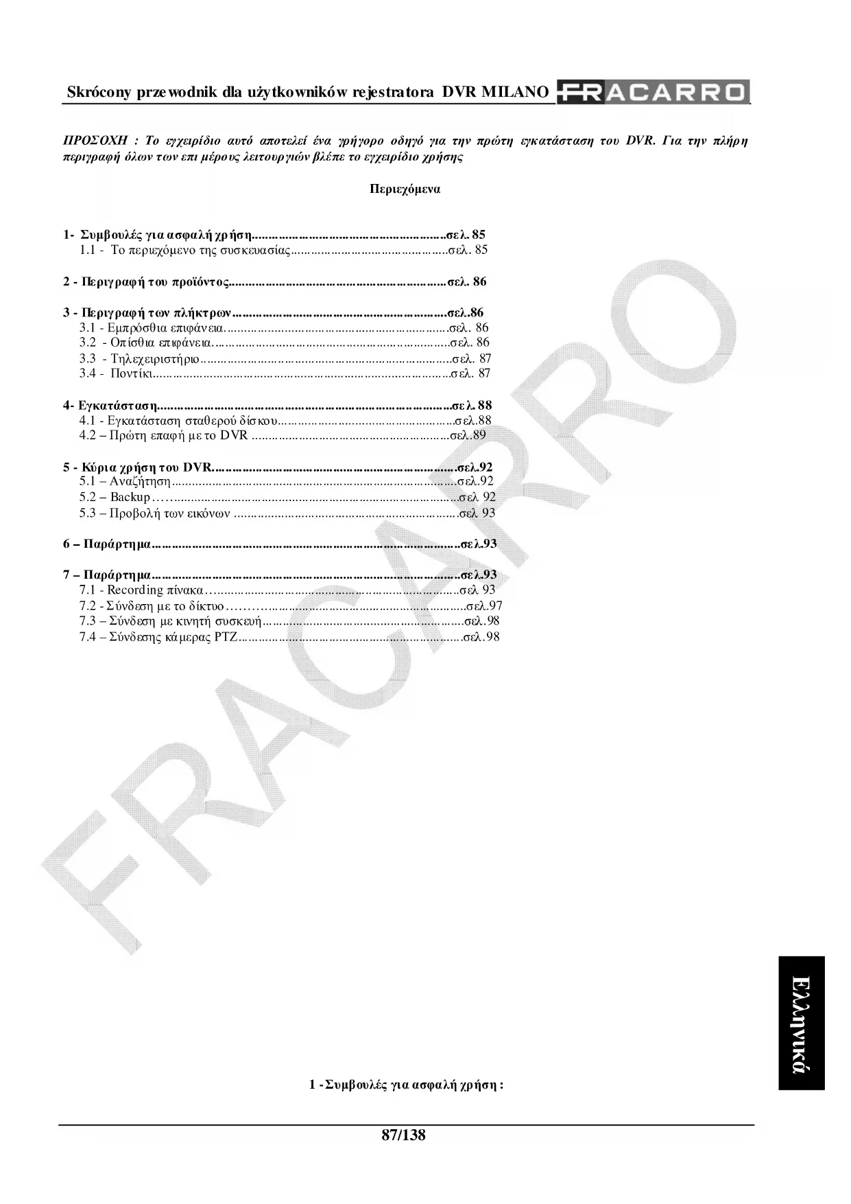 ΠΡΟΣΟΧΗ : Το εγχειρίδιο αυτό αποτελεί ένα γρήγορο οδηγό για την πρώτη εγκατάσταση του DVR. Για την πλήρη περιγραφή όλων των επι µέρους λειτουργιών βλέπε το εγχειρίδιο χρήσης Περιεχόµενα