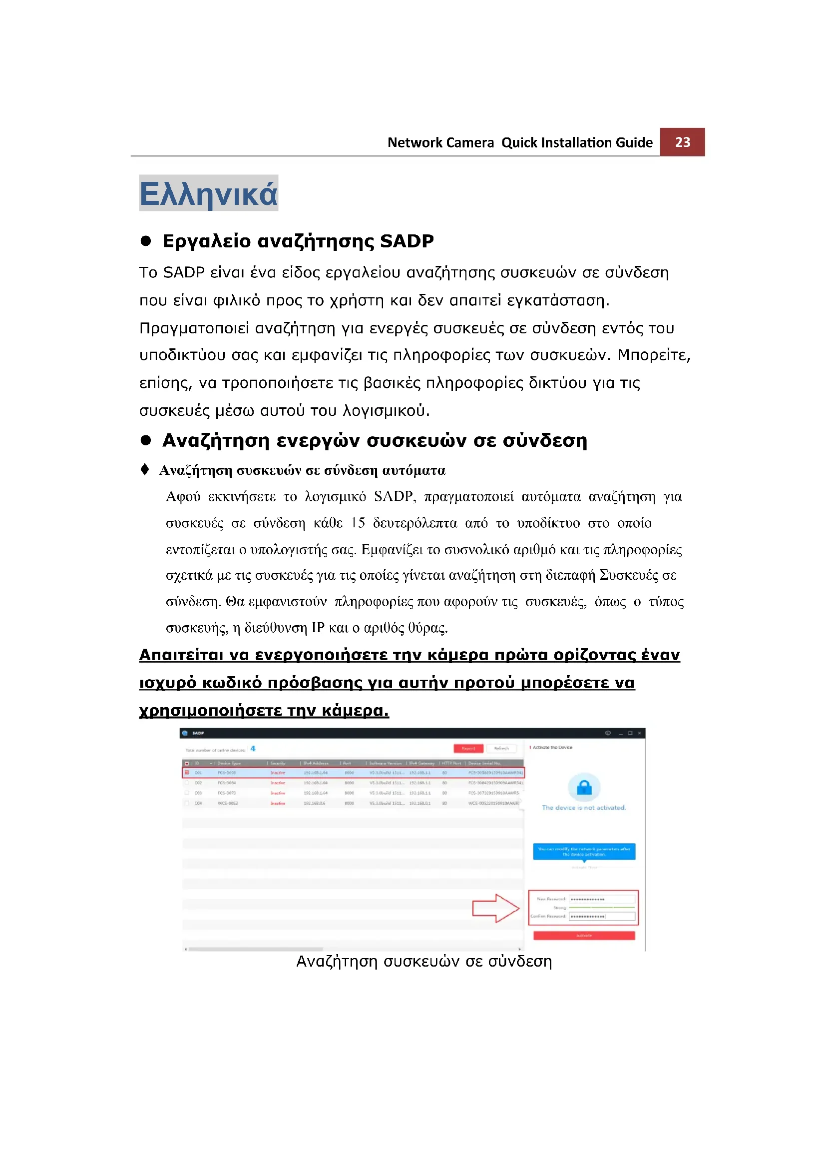 Εργαλείο αναζήτησης SADP Το SADP είναι ένα είδος εργαλείου αναζήτησης συσκευών σε σύνδεση που είναι φιλικό προς το χρήστη και δεν απαιτεί εγκατάσταση. Πραγματοποιεί αναζήτηση για ενεργές συσκευές σε σύνδεση εντός του υποδικτύου σας και εμφανίζει τις πληροφορίες των συσκυεών. Μπορείτε, επίσης, να τροποποιήσετε τις βασικές πληροφορίες δικτύου για τις συσκευές μέσω αυτού του λογισμικού. Αναζήτηση ενεργών συσκευών σε σύνδεση Αναζήτηση συσκευών σε σύνδεση αυτόματα Αφού εκκινήσετε το λογισμικό SADP, πραγματοποιεί αυτόματα αναζήτηση για συσκευές σε σύνδεση κάθε 15 δευτερόλεπτα από το υποδίκτυο στο οποίο εντοπίζεται ο υπολογιστής σας. Εμφανίζει το συσνολικό αριθμό και τις πληροφορίες σχετικά με τις συσκευές για τις οποίες γίνεται αναζήτηση στη διεπαφή Συσκευές σε σύνδεση. Θα εμφανιστούν πληροφορίες που αφορούν τις συσκευές, όπως ο τύπος συσκευής, η διεύθυνση IP και ο αριθός θύρας. Απαιτείται να ενεργοποιήσετε την κάμερα πρώτα ορίζοντας έναν ισχυρό κωδικό πρόσβασης για αυτήν προτού μπορέσετε να χρησιμοποιήσετε την κάμερα. Αναζήτηση συσκευών σε σύνδεση24 Network Camera Quick Installation Guide