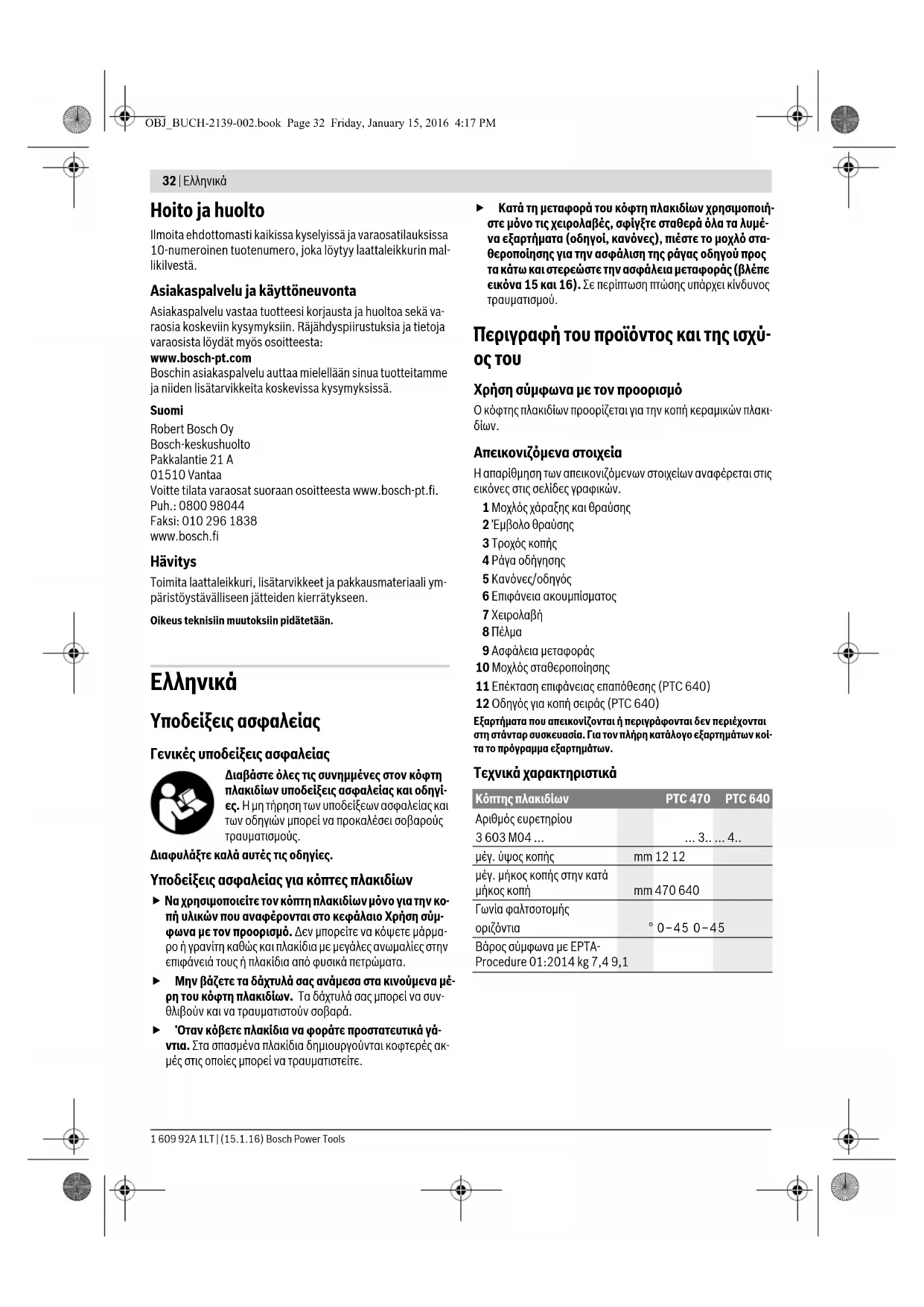 ° 0–45 0–45 Βάρος σύμφωνα με EPTA- Procedure 01:2014 kg 7,4 9,1 OBJ_BUCH-2139-002.book Page 32 Friday, January 15, 2016 4:17 PMTürkçe | 33 Bosch Power Tools 1 609 92A 1LT | (15.1.16) Συμβουλές για τη χρήση Συντήρηση και Service Όταν ζητάτε πληροφορίες καθώς και όταν παραγγέλνετε ανταλ- λακτικά παρακαλούμε να αναφέρετε οπωσδήποτε το 10 ψήφιο αριθμό ευρετηρίου που αναφέρεται στην πινακίδα κατασκευα- στή του κόπτη πλακιδίων. Service και παροχή συμβουλών χρήσης Το Service απαντά στις ερωτήσεις σας σχετικά με την επισκευή και τη συντήρηση του προϊόνος σας καθώς για τα κατάλληλα ανταλλακτικά: www.bosch-pt.com Η ομάδα παροχής συμβουλών της Bosch απαντά ευχαρίστως στις ερωτήσεις σας σχετικά με τα προϊόντα μας και τα ανταλλα- κτικά τους.