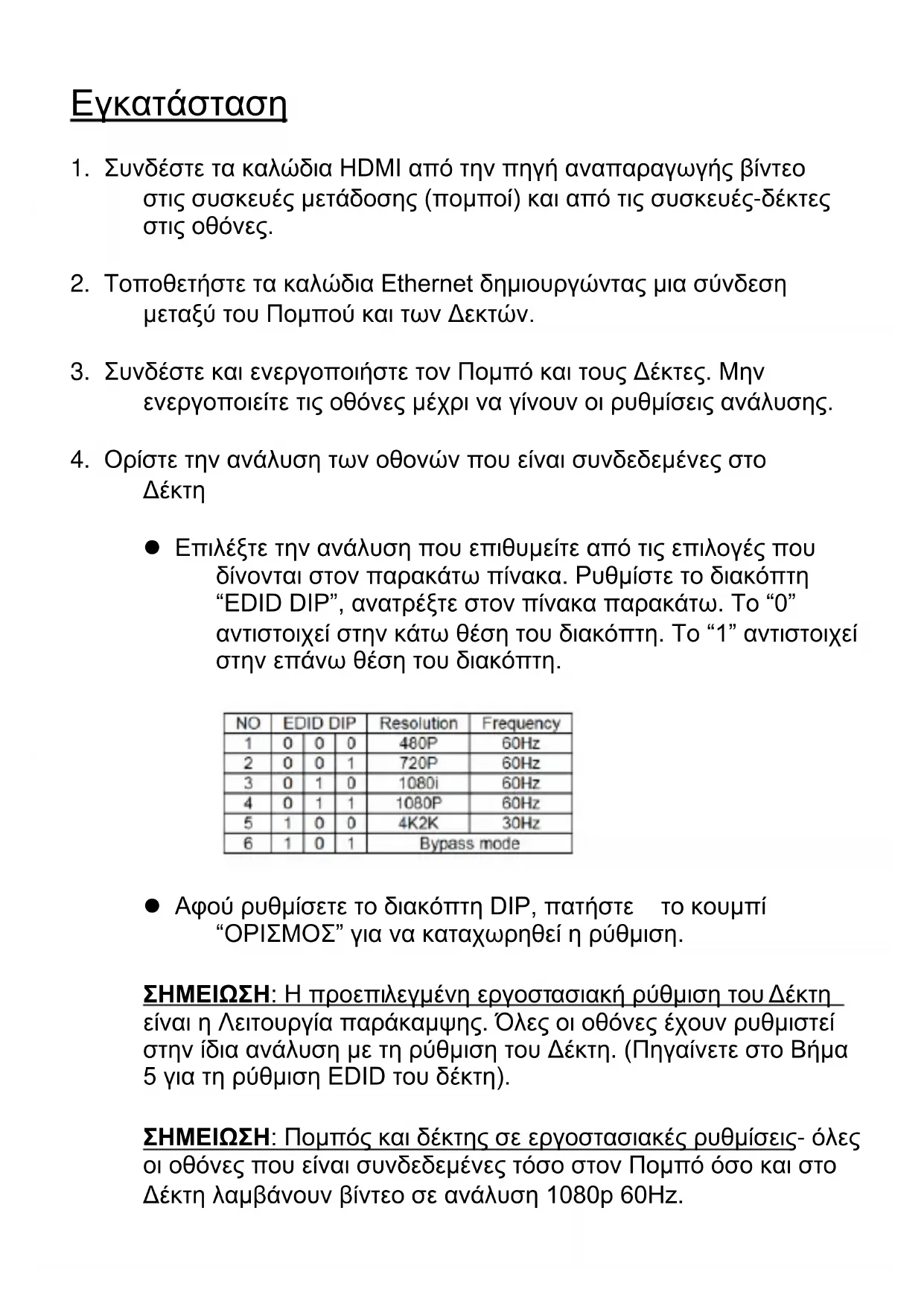 απευθείας στον Πομπό. Εάν δεν απαιτείται προβολή σε τοπικό επίπεδο στον πομπό, παραλείψτε αυτό το βήμα. Εάν η προβολή δεν είναι η επιθυμητή ή απαιτείται συγκεκριμένη ανάλυση, ορίστε την ρύθμιση με τον παρακάτω τρόπο- Επιλέξτε την ανάλυση που επιθυμείτε από τις επιλογές που δίνονται στον παρακάτω πίνακα. Ρυθμίστε το διακόπτη “EDID DIP”, ανατρέξτε στον πίνακα παρακάτω. Το “0” αντιστοιχεί στην κάτω θέση του διακόπτη. Το “1” αντιστοιχεί στην επάνω θέση του διακόπτη. Αφού ρυθμίσετε το διακόπτη DIP, πατήστε το κουμπί “ΟΡΙΣΜΟΣ” για να καταχωρηθεί η ρύθμιση. ΣΗΜΕΙΩΣΗ: Η προεπιλεγμένη εργοστασιακή ρύθμιση του δέκτη είναι βίντεο σε ανάλυση 1080p 60Hz. ΣΗΜΕΙΩΣΗ: Για το Δέκτη ορίζεται η λειτουργία παράκαμψης, για τον πομπό ορίζεται η Ανάγνωση EDID ΕΞΟΔΟΥ ΣΕ ΤΟΠΙΚΟ ΕΠΙΠΕΔΟ- Ο πομπός διαβάζει EDID από τη συνδεδεμένη οθόνηκαι τροφοδοτεί με την ίδια ρύθμιση όλες τις οθόνες που είναι συνδεδεμένες με το Δέκτη. Όταν δεν υπάρχει κάποια οθόνη σε τοπικό επίπεδο που να είναι απευθείας συνδεδεμένη στο δέκτη, η ανίχνευση των EDID δεν είναι δυνατή και ενδέχεται να προκύψει σφάλμα κατά την προβολή.