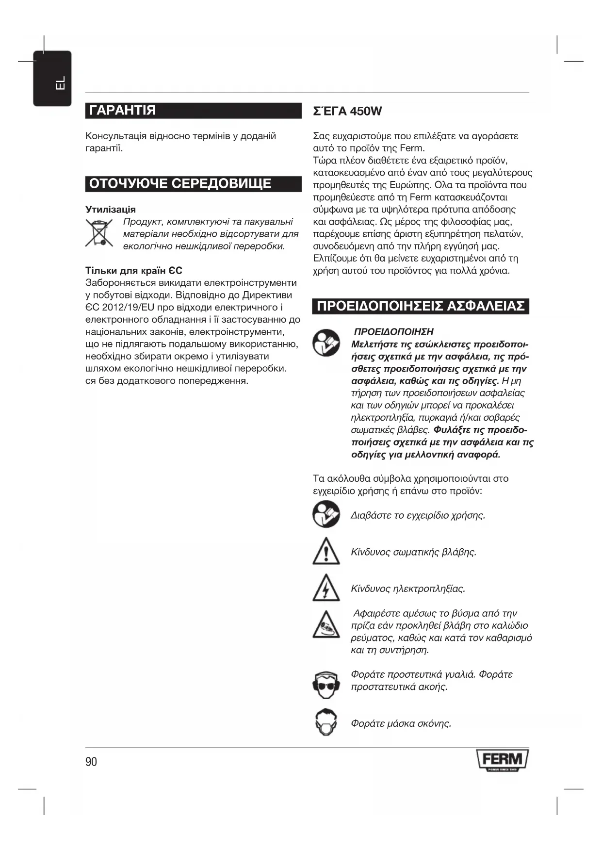Продукт, комплектуючі та пакувальні матеріали необхідно відсортувати для екологічно нешкідливої переробки. Тільки для країн ЄС Забороняється викидати електроінструменти у побутові відходи. Відповідно до Директиви ЄС 2012/19/EU про відходи електричного і електронного обладнання і її застосуванню до національних законів, електроінструменти, що не підлягають подальшому використанню, необхідно збирати окремо і утилізувати шляхом екологічно нешкідливої переробки. ся без додаткового попередження. ΣΈΓΑ 450W Σας ευχαριστούμε που επιλέξατε να αγοράσετε αυτό το προϊόν της Ferm. Τώρα πλέον διαθέτετε ένα εξαιρετικό προϊόν, κατασκευασμένο από έναν από τους μεγαλύτερους προμηθευτές της Ευρώπης. Ολα τα προϊόντα που προμηθεύεστε από τη Ferm κατασκευάζονται σύμφωνα με τα υψηλότερα πρότυπα απόδοσης και ασφάλειας. Ως μέρος της φιλοσοφίας μας, παρέχουμε επίσης άριστη εξυπηρέτηση πελατών, συνοδευόμενη από την πλήρη εγγύησή μας. Ελπίζουμε ότι θα μείνετε ευχαριστημένοι από τη χρήση αυτού του προϊόντος για πολλά χρόνια. ΠΡΟΕΙΔΟΠΟΙΉΣΕΙΣ ΑΣΦΑΛΕΙΑΣ ΠΡΟΕΙΔΟΠΟΙΗΣΗ Μελετήστε τις εσώκλειστες προειδοποι- ήσεις σχετικά με την ασφάλεια, τις πρό- σθετες προειδοποιήσεις σχετικά με την ασφάλεια, καθώς και τις οδηγίες. Η μη τήρηση των προειδοποιήσεων ασφαλείας και των οδηγιών μπορεί να προκαλέσει ηλεκτροπληξία, πυρκαγιά ή/και σοβαρές σωματικές βλάβες. Φυλάξτε τις προειδο- ποιήσεις σχετικά με την ασφάλεια και τις οδηγίες για μελλοντική αναφορά. Τα ακόλουθα σύμβολα χρησιμοποιούνται στο εγχειρίδιο χρήσης ή επάνω στο προϊόν: Διαβάστε το εγχειρίδιο χρήσης. Κίνδυνος σωματικής βλάβης. Κίνδυνος ηλεκτροπληξίας. Αφαιρέστε αμέσως το βύσμα από την πρίζα εάν προκληθεί βλάβη στο καλώδιο ρεύματος, καθώς και κατά τον καθαρισμό και τη συντήρηση. Φοράτε προστευτικά γυαλιά. Φοράτε προστατευτικά ακοής. Φοράτε μάσκα σκόνης.91