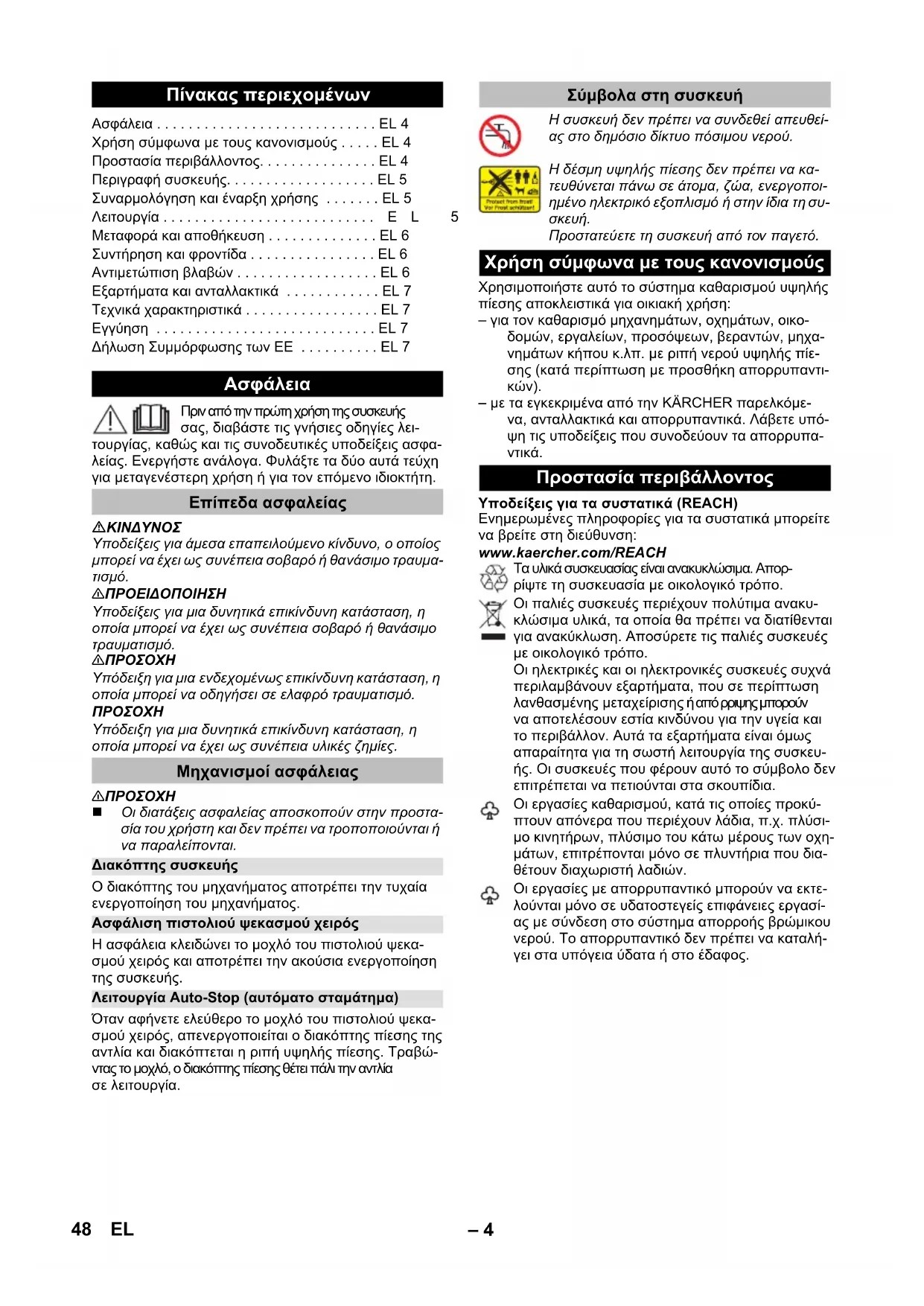 Υποδείξεις για τα συστατικά (REACH) Ενημερωμένες πληροφορίες για τα συστατικά μπορείτε να βρείτε στη διεύθυνση: www.kaercher.com/REACH Πίνακας περιεχομένων Ασφάλεια . . . . . . . . . . . . . . . . . . . . . . . . . . . . EL 4 Χρήση σύμφωνα με τους κανονισμούς . . . . . EL 4 Προστασία περιβάλλοντος. . . . . . . . . . . . . . . EL 4 Περιγραφή συσκευής. . . . . . . . . . . . . . . . . . . EL 5 Συναρμολόγηση και έναρξη χρήσης . . . . . . . EL 5 Λειτουργία . . . . . . . . . . . . . . . . . . . . . . . . . . .EL 5 Μεταφορά και αποθήκευση . . . . . . . . . . . . . . EL 6 Συντήρηση και φροντίδα . . . . . . . . . . . . . . . . EL 6 Αντιμετώπιση βλαβών . . . . . . . . . . . . . . . . . . EL 6 Εξαρτήματα και ανταλλακτικά . . . . . . . . . . . . EL 7 Τεχνικά χαρακτηριστικά . . . . . . . . . . . . . . . . . EL 7 Εγγύηση . . . . . . . . . . . . . . . . . . . . . . . . . . . . EL 7 Δήλωση Συμμόρφωσης των ΕE . . . . . . . . . . EL 7