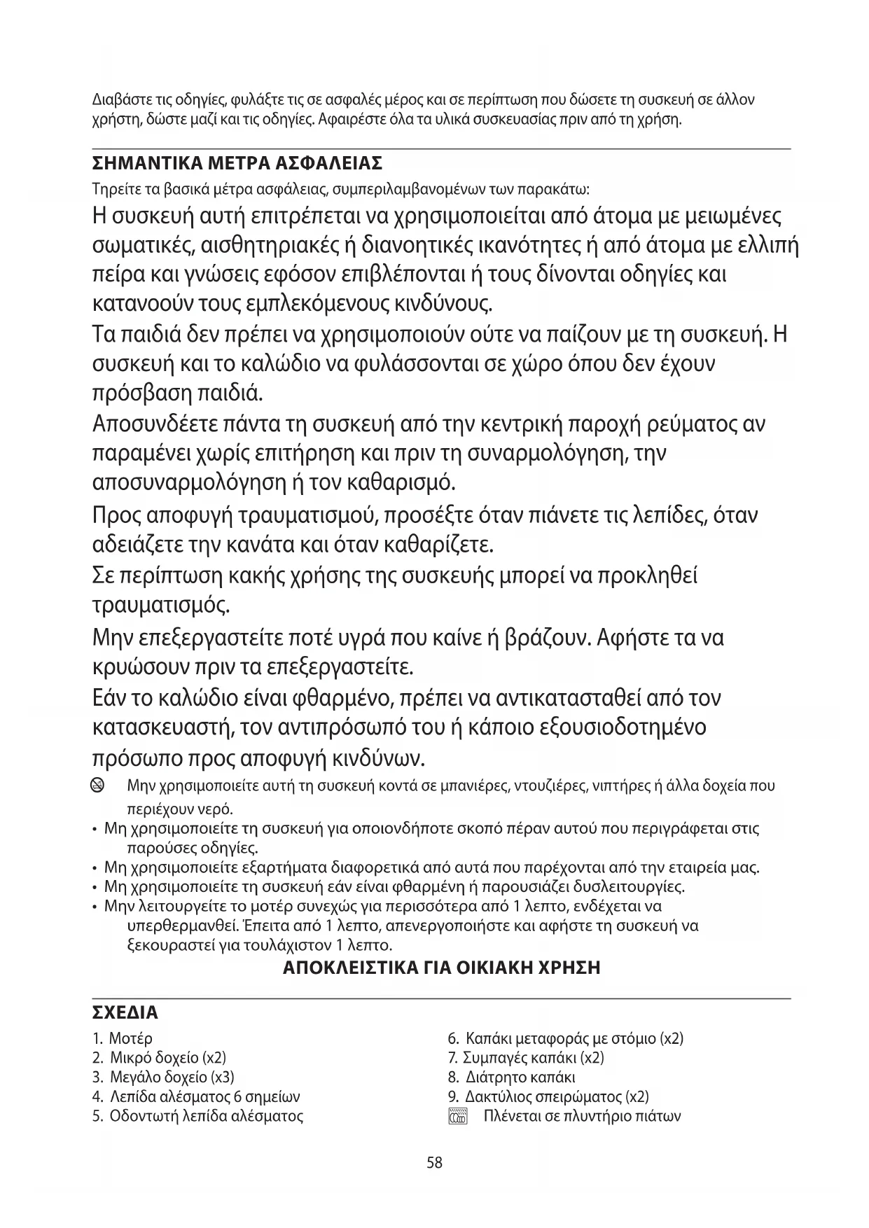 Τηρείτε τα βασικά μέτρα ασφάλειας, συμπεριλαμβανομένων των παρακάτω: Η συσκευή αυτή επιτρέπεται να χρησιμοποιείται από άτομα με μειωμένες σωματικές, αισθητηριακές ή διανοητικές ικανότητες ή από άτομα με ελλιπή πείρα και γνώσεις εφόσον επιβλέπονται ή τους δίνονται οδηγίες και κατανοούν τους εμπλεκόμενους κινδύνους. Τα παιδιά δεν πρέπει να χρησιμοποιούν ούτε να παίζουν με τη συσκευή. Η συσκευή και το καλώδιο να φυλάσσονται σε χώρο όπου δεν έχουν πρόσβαση παιδιά. Αποσυνδέετε πάντα τη συσκευή από την κεντρική παροχή ρεύματος αν παραμένει χωρίς επιτήρηση και πριν τη συναρμολόγηση, την αποσυναρμολόγηση ή τον καθαρισμό. Προς αποφυγή τραυματισμού, προσέξτε όταν πιάνετε τις λεπίδες, όταν αδειάζετε την κανάτα και όταν καθαρίζετε. Σε περίπτωση κακής χρήσης της συσκευής μπορεί να προκληθεί τραυματισμός. Μην επεξεργαστείτε ποτέ υγρά που καίνε ή βράζουν. Αφήστε τα να κρυώσουν πριν τα επεξεργαστείτε. Εάν το καλώδιο είναι φθαρμένο, πρέπει να αντικατασταθεί από τον κατασκευαστή, τον αντιπρόσωπό του ή κάποιο εξουσιοδοτημένο πρόσωπο προς αποφυγή κινδύνων. b Μην χρησιμοποιείτε αυτή τη συσκευή κοντά σε μπανιέρες, ντουζιέρες, νιπτήρες ή άλλα δοχεία που περιέχουν νερό.