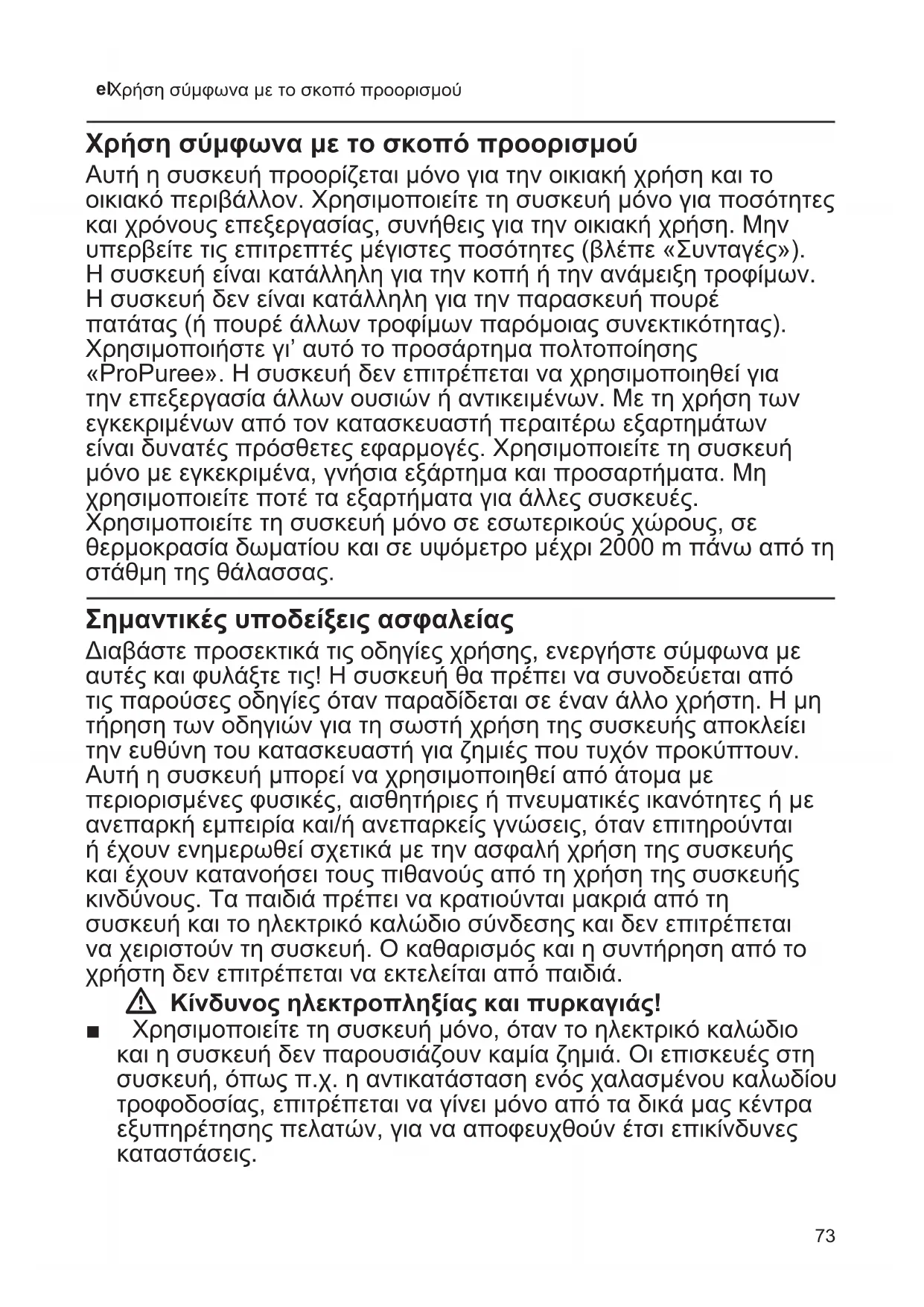 Χρήση σύμφωνα με το σκοπό προορισμού Χρήση σύμφωνα με το σκοπό προορισμού Αυτή η συσκευή προορίζεται μόνο για την οικιακή χρήση και το οικιακό περιβάλλον. Χρησιμοποιείτε τη συσκευή μόνο για ποσότητες και χρόνους επεξεργασίας, συνήθεις για την οικιακή χρήση. Μην υπερβείτε τις επιτρεπτές μέγιστες ποσότητες (βλέπε «Συνταγές»). Η συσκευή είναι κατάλληλη για την κοπή ή την ανάμειξη τροφίμων. Η συσκευή δεν είναι κατάλληλη για την παρασκευή πουρέ πατάτας (ή πουρέ άλλων τροφίμων παρόμοιας συνεκτικότητας). Χρησιμοποιήστε γι’ αυτό το προσάρτημα πολτοποίησης «ProPuree». Η συσκευή δεν επιτρέπεται να χρησιμοποιηθεί για την επεξεργασία άλλων ουσιών ή αντικειμένων. Με τη χρήση των εγκεκριμένων από τον κατασκευαστή περαιτέρω εξαρτημάτων είναι δυνατές πρόσθετες εφαρμογές. Χρησιμοποιείτε τη συσκευή μόνο με εγκεκριμένα, γνήσια εξάρτημα και προσαρτήματα. Μη χρησιμοποιείτε ποτέ τα εξαρτήματα για άλλες συσκευές. Χρησιμοποιείτε τη συσκευή μόνο σε εσωτερικούς χώρους, σε θερμοκρασία δωματίου και σε υψόμετρο μέχρι 2000 m πάνω από τη στάθμη της θάλασσας. Σημαντικές υποδείξεις ασφαλείας Διαβάστε προσεκτικά τις οδηγίες χρήσης, ενεργήστε σύμφωνα με αυτές και φυλάξτε τις! Η συσκευή θα πρέπει να συνοδεύεται από τις παρούσες οδηγίες όταν παραδίδεται σε έναν άλλο χρήστη. Η μη τήρηση των οδηγιών για τη σωστή χρήση της συσκευής αποκλείει την ευθύνη του κατασκευαστή για ζημιές που τυχόν προκύπτουν. Αυτή η συσκευή μπορεί να χρησιμοποιηθεί από άτομα με περιορισμένες φυσικές, αισθητήριες ή πνευματικές ικανότητες ή με ανεπαρκή εμπειρία και/ή ανεπαρκείς γνώσεις, όταν επιτηρούνται ή έχουν ενημερωθεί σχετικά με την ασφαλή χρήση της συσκευής και έχουν κατανοήσει τους πιθανούς από τη χρήση της συσκευής κινδύνους. Τα παιδιά πρέπει να κρατιούνται μακριά από τη συσκευή και το ηλεκτρικό καλώδιο σύνδεσης και δεν επιτρέπεται να χειριστούν τη συσκευή. Ο καθαρισμός και η συντήρηση από το χρήστη δεν επιτρέπεται να εκτελείται από παιδιά. W Κίνδυνος ηλεκτροπληξίας και πυρκαγιάς! ■ Χρησιμοποιείτε τη συσκευή μόνο, όταν το ηλεκτρικό καλώδιο και η συσκευή δεν παρουσιάζουν καμία ζημιά. Οι επισκευές στη συσκευή, όπως π.χ. η αντικατάσταση ενός χαλασμένου καλωδίου τροφοδοσίας, επιτρέπεται να γίνει μόνο από τα δικά μας κέντρα εξυπηρέτησης πελατών, για να αποφευχθούν έτσι επικίνδυνες καταστάσεις.74 el Σημαντικές υποδείξεις ασφαλείας ■ Μη συνδέσετε ποτέ τη συσκευή σε χρονοδιακόπτες ή σε τηλεχειριζόμενες πρίζες. Παρακολουθείτε πάντοτε τη συσκευή κατά τη διάρκεια της λειτουργίας! ■ Μην τοποθετείτε τη συσκευή πάνω ή κοντά σε πολύ ζεστές επιφάνειες, όπως π.χ. πλάκες εστιών. ■ Μη βυθίσετε ποτέ τη βασική συσκευή σε υγρά ή μην την κρατήσετε κάτω από τρεχούμενο νερό και μην την καθαρίσετε στο πλυντήριο πιάτων. Μη χρησιμοποιήσετε κανέναν ατμοκαθαριστή. Μη χρησιμοποιείτε τη συσκευή με βρεγμένα χέρια. ■ Όταν η συσκευή σας πέσει στο νερό ή σε κάποιο άλλο υγρό, δεν επιτρέπεται, να χρησιμοποιήσετε ξανά τη συσκεύή. ■ Βυθίζετε το πόδι του μίξερ το πολύ μέχρι το μαρκάρισμα Í στα αναμειγνυόμενα υλικά, διαφορετικά υπάρχει κίνδυνος ηλεκτροπληξίας! ■ Η συσκευή μετά από κάθε χρήση, σε περίπτωση μη επιτήρησης, πριν από τη συναρμολόγηση, την αποσυναρμολόγηση ή τον καθαρισμό και σε περίπτωση σφάλματος πρέπει να αποσυνδέεται πάντοτε από την παροχή ρεύματος. W Κίνδυνος τραυματισμού! ■ Η συσκευή μετά από κάθε χ