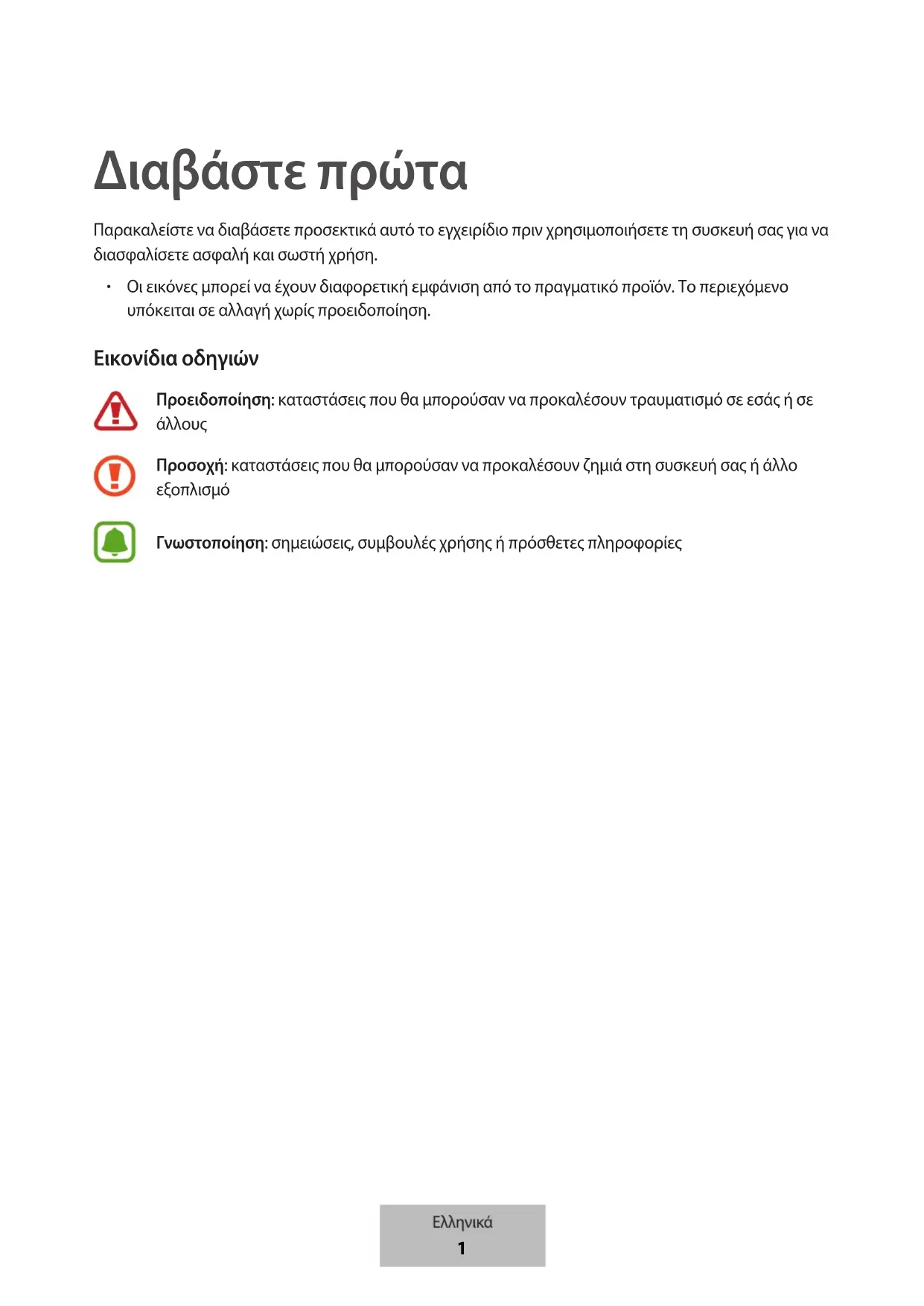 Οι εικόνες μπορεί να έχουν διαφορετική εμφάνιση από το πραγματικό προϊόν. Το περιεχόμενο υπόκειται σε αλλαγή χωρίς προειδοποίηση. Εικονίδια οδηγιών Προειδοποίηση: καταστάσεις που θα μπορούσαν να προκαλέσουν τραυματισμό σε εσάς ή σε