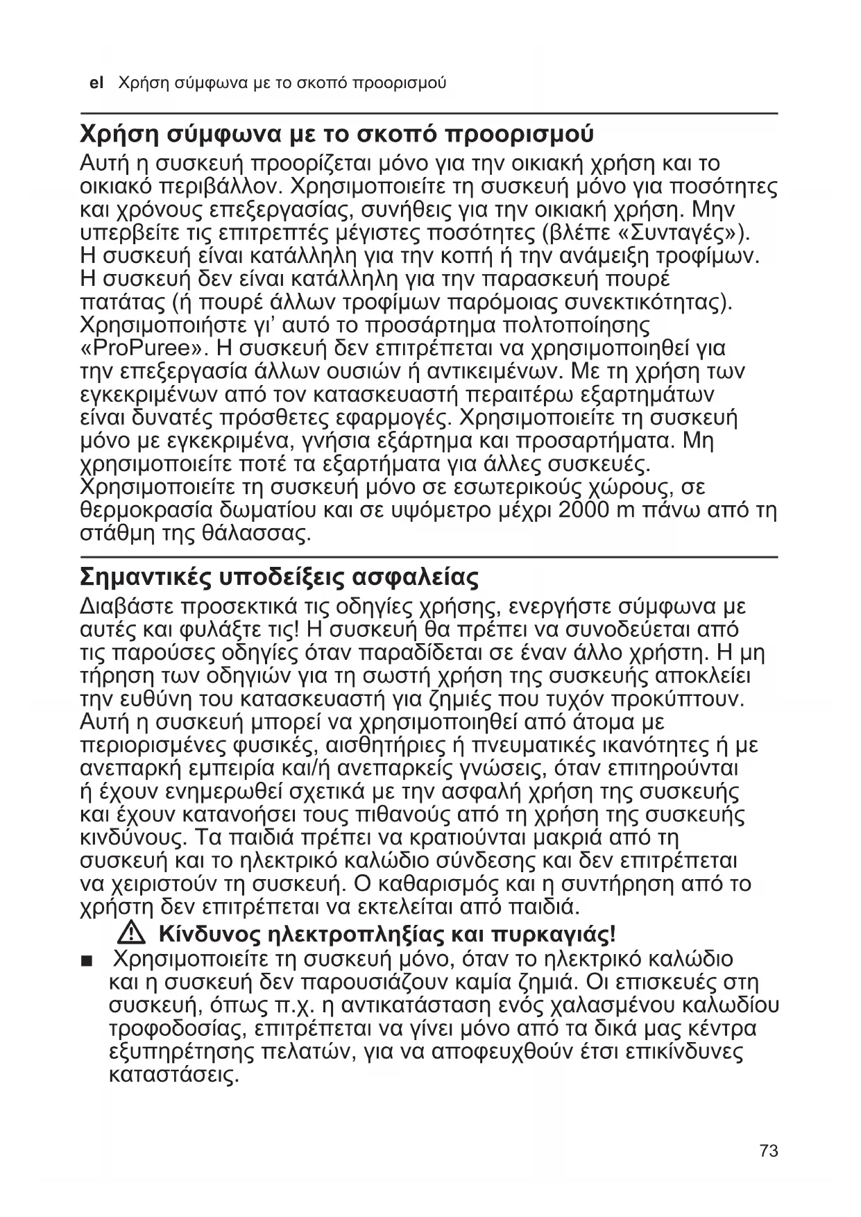 - entanto, necessária a apresentação do documento de compra do aparelho. Salvo alterações técnicas.73 el Χρήση σύμφωνα με το σκοπό προορισμού Χρήση σύμφωνα με το σκοπό προορισμού Αυτή η συσκευή προορίζεται μόνο για την οικιακή χρήση και το οικιακό περιβάλλον. Χρησιμοποιείτε τη συσκευή μόνο για ποσότητες και χρόνους επεξεργασίας, συνήθεις για την οικιακή χρήση. Μην υπερβείτε τις επιτρεπτές μέγιστες ποσότητες (βλέπε «Συνταγές»). Η συσκευή είναι κατάλληλη για την κοπή ή την ανάμειξη τροφίμων. Η συσκευή δεν είναι κατάλληλη για την παρασκευή πουρέ πατάτας (ή πουρέ άλλων τροφίμων παρόμοιας συνεκτικότητας). Χρησιμοποιήστε γι’ αυτό το προσάρτημα πολτοποίησης «ProPuree». Η συσκευή δεν επιτρέπεται να χρησιμοποιηθεί για την επεξεργασία άλλων ουσιών ή αντικειμένων. Με τη χρήση των εγκεκριμένων από τον κατασκευαστή περαιτέρω εξαρτημάτων είναι δυνατές πρόσθετες εφαρμογές. Χρησιμοποιείτε τη συσκευή μόνο με εγκεκριμένα, γνήσια εξάρτημα και προσαρτήματα. Μη χρησιμοποιείτε ποτέ τα εξαρτήματα για άλλες συσκευές. Χρησιμοποιείτε τη συσκευή μόνο σε εσωτερικούς χώρους, σε θερμοκρασία δωματίου και σε υψόμετρο μέχρι 2000 m πάνω από τη στάθμη της θάλασσας. Σημαντικές υποδείξεις ασφαλείας Διαβάστε προσεκτικά τις οδηγίες χρήσης, ενεργήστε σύμφωνα με αυτές και φυλάξτε τις! Η συσκευή θα πρέπει να συνοδεύεται από τις παρούσες οδηγίες όταν παραδίδεται σε έναν άλλο χρήστη. Η μη τήρηση των οδηγιών για τη σωστή χρήση της συσκευής αποκλείει την ευθύνη του κατασκευαστή για ζημιές που τυχόν προκύπτουν. Αυτή η συσκευή μπορεί να χρησιμοποιηθεί από άτομα με περιορισμένες φυσικές, αισθητήριες ή πνευματικές ικανότητες ή με ανεπαρκή εμπειρία και/ή ανεπαρκείς γνώσεις, όταν επιτηρούνται ή έχουν ενημερωθεί σχετικά με την ασφαλή χρήση της συσκευής και έχουν κατανοήσει τους πιθανούς από τη χρήση της συσκευής κινδύνους. Τα παιδιά πρέπει να κρατιούνται μακριά από τη συσκευή και το ηλεκτρικό καλώδιο σύνδεσης και δεν επιτρέπεται να χειριστούν τη συσκευή. Ο καθαρισμός και η συντήρηση από το χρήστη δεν επιτρέπεται να εκτελείται από παιδιά. W Κίνδυνος ηλεκτροπληξίας και πυρκαγιάς! ■ Χρησιμοποιείτε τη συσκευή μόνο, όταν το ηλεκτρικό καλώδιο και η συσκευή δεν παρουσιάζουν καμία ζημιά. Οι επισκευές στη συσκευή, όπως π.χ. η αντικατάσταση ενός χαλασμένου καλωδίου τροφοδοσίας, επιτρέπεται να γίνει μόνο από τα δικά μας κέντρα εξυπηρέτησης πελατών, για να αποφευχθούν έτσι επικίνδυνες καταστάσεις.74 el Σημαντικές υποδείξεις ασφαλείας ■ Μη συνδέσετε ποτέ τη συσκευή σε χρονοδιακόπτες ή σε τηλεχειριζόμενες πρίζες. Παρακολουθείτε πάντοτε τη συσκευή κατά τη διάρκεια της λειτουργίας! ■ Μην τοποθετείτε τη συσκευή πάνω ή κοντά σε πολύ ζεστές επιφάνειες, όπως π.χ. πλάκες εστιών. ■ Μη βυθίσετε ποτέ τη βασική συσκευή σε υγρά ή μην την κρατήσετε κάτω από τρεχούμενο νερό και μην την καθαρίσετε στο πλυντήριο πιάτων. Μη χρησιμοποιήσετε κανέναν ατμοκαθαριστή. Μη χρησιμοποιείτε τη συσκευή με βρεγμένα χέρια. ■ Όταν η συσκευή σας πέσει στο νερό ή σε κάποιο άλλο υγρό, δεν επιτρέπεται, να χρησιμοποιήσετε ξανά τη συσκεύή. ■ Βυθίζετε το πόδι του μίξερ το πολύ μέχρι το μαρκάρισμα Í στα αναμειγνυόμενα υλικά, διαφορετικά υπάρχει κίνδυνος ηλεκτροπληξίας! ■ Η συσκευή μετά από κάθε χρήση, σε περίπτωση μη επιτήρησης, πριν από τη συναρμολόγηση, την αποσυναρμολόγηση ή τον καθαρισμό και σε περίπτωση σφάλματος πρέπει να αποσυνδέεται πάντοτε από την παροχή 