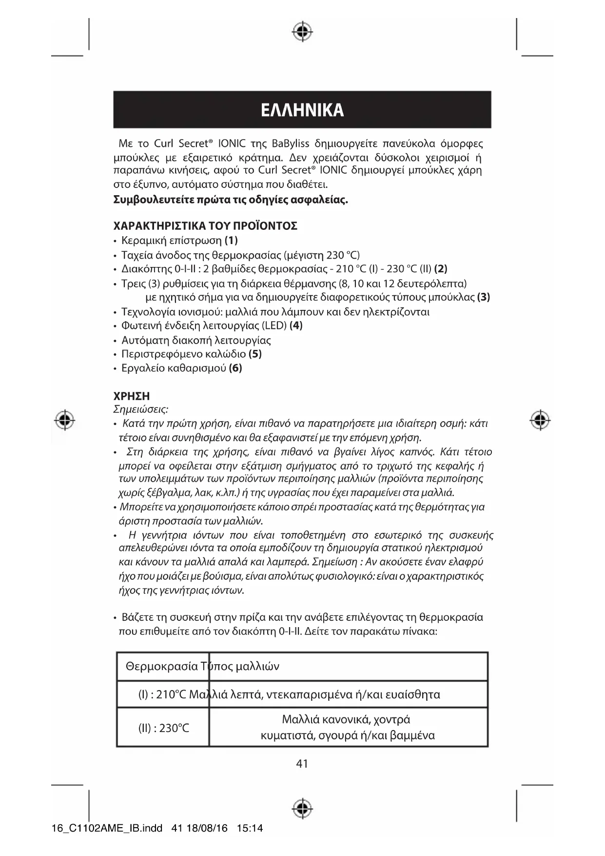 - Βάζετε τη συσκευή στην πρίζα και την ανάβετε επιλέγοντας τη θερμοκρασία που επιθυμείτε από τον διακόπτη 0-I-II. ∆είτε τον παρακάτω πίνακα: Θερμοκρασία Τύπος μαλλιών (I) : 210°C Μαλλιά λεπτά, ντεκαπαρισμένα ή/και ευαίσθητα (II) : 230°C Μαλλιά κανονικά, χοντρά κυματιστά, σγουρά ή/και βαμμένα 16_C1102AME_IB.indd 41 18/08/16 15:1442